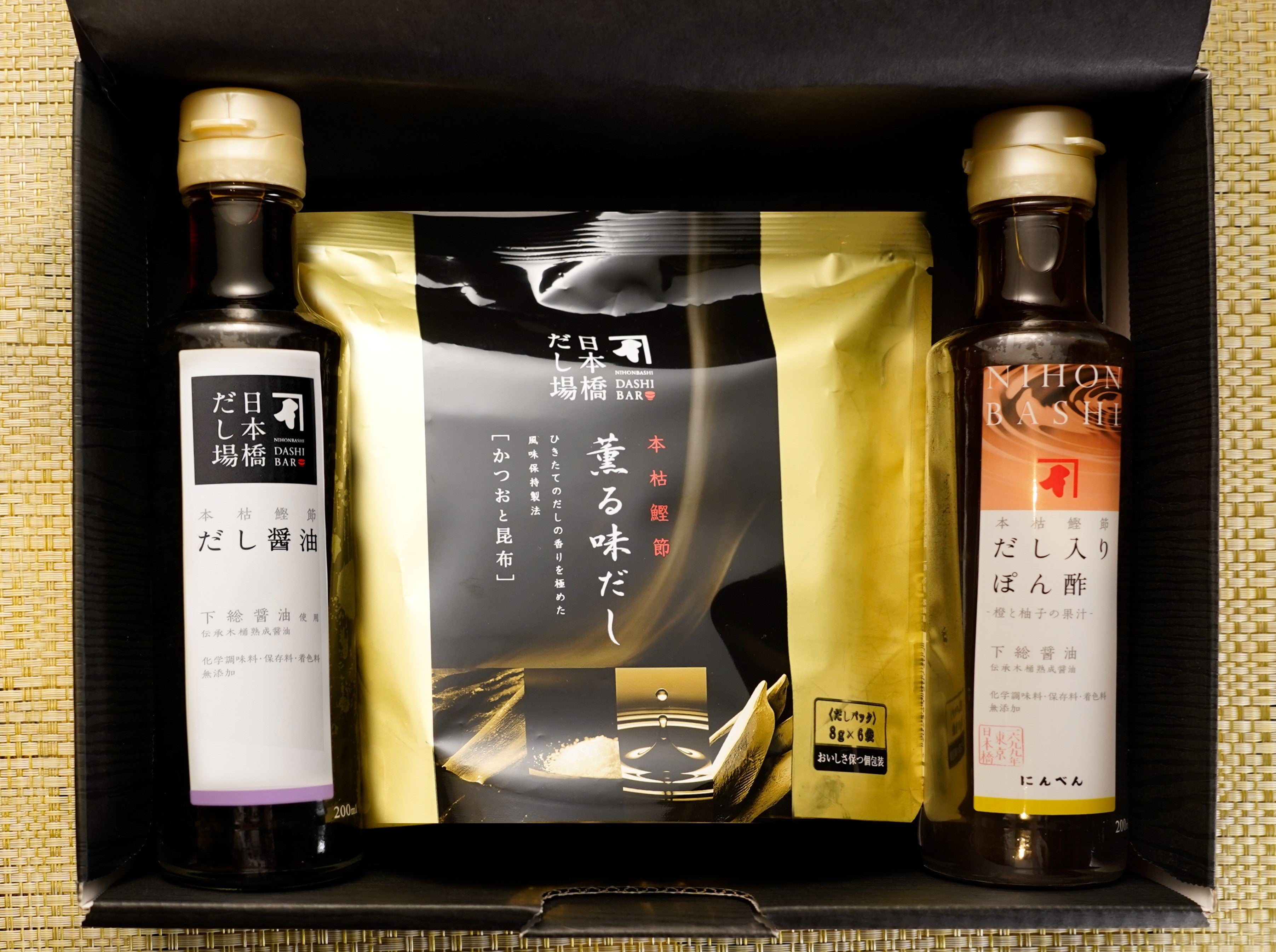下総醤油を贅沢に使用し、本枯鰹節、鯖節、宗田鰹節を組み合せ、だしと醤油の旨味の濃い味わいに仕上げております。残っただし醤油は煮物など他のお料理にお使いいただけます。
