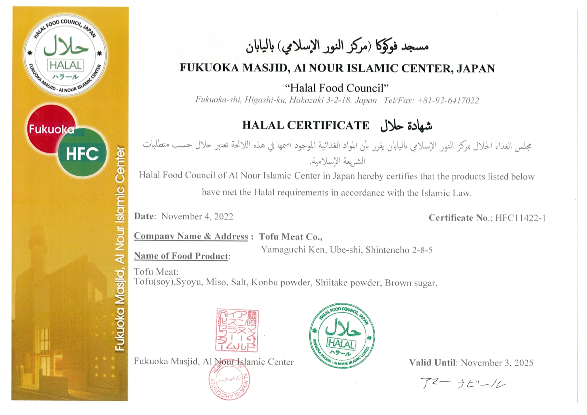 トーフミートは2022年11月4日(金)に福岡マスジド アンヌールイスラム文化センターの監査を経て、ローカルハラル認証を取得しています。