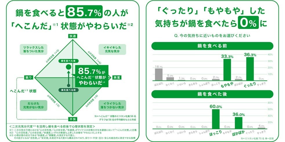 その結果、「へこんだ」※1状態の社員56名のうち85.7%がへこんだ状態がやわらぐ※2という試験結果となりました。また「ぐったり」「もやもや」した気持ちが鍋を食べたら「ほっこり」「ぽかぽか」に変化し、気持ちが落ち着いたという声も見られました。