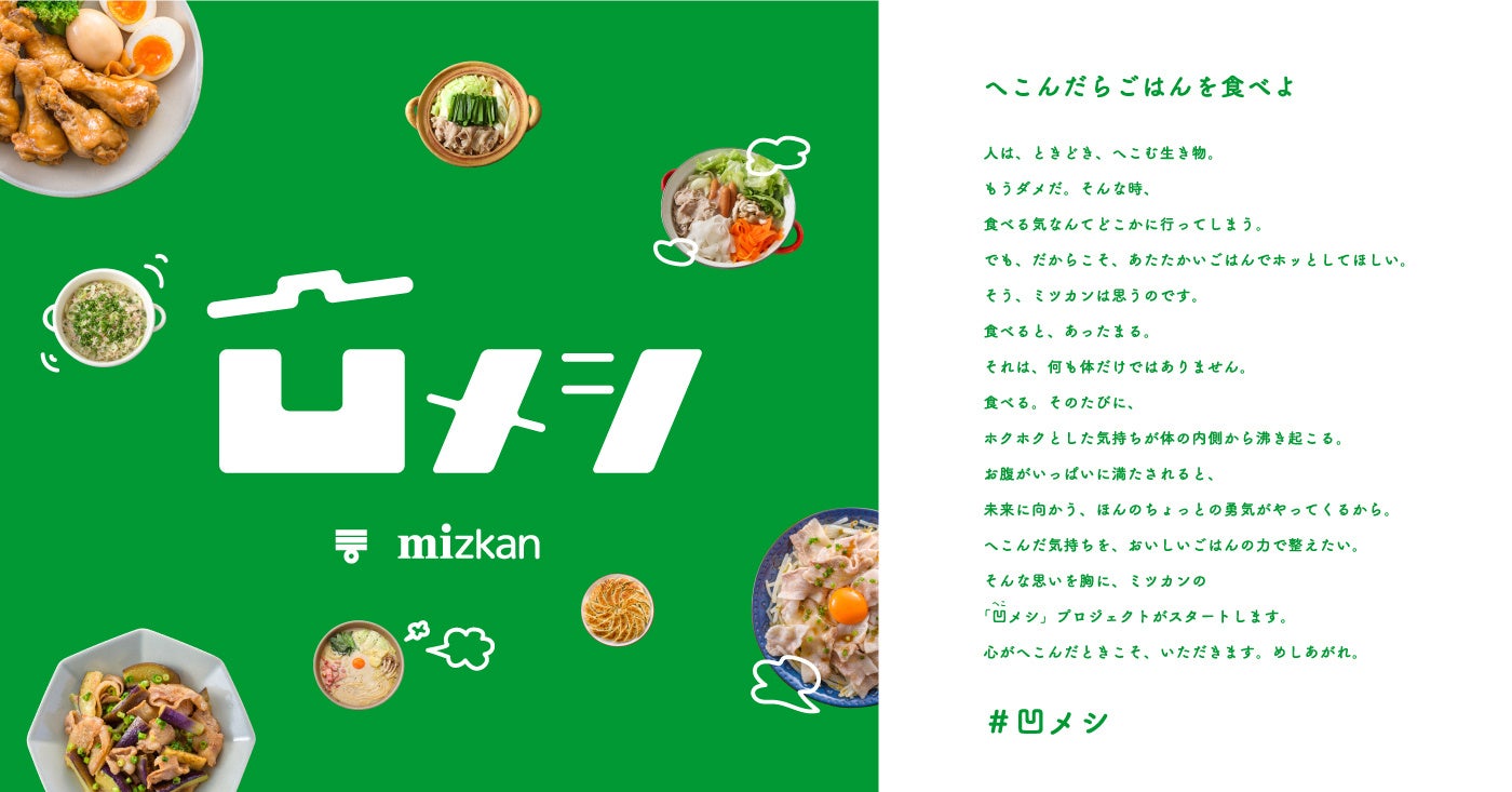 株式会社Mizkan (本社:愛知県半田市、代表取締役社長兼 CEO :吉永 智征、以下:ミツカン)は、ウェルビーイングの実現に向けて、へこんだ気持ちをごはんの力であたためる「凹 (へこ)メシ」 プロジェクトを開始いたします。ミツカンは「おいしさと健康の一致」を目指し、身体のみならず「心の健康」の実現を支援するために、プロジェクトを推進する組織として「凹んでない課」を新設。ごはんの力でみなさまを元気づける取り組みを、社内外問わず中長期的に展開してまいります。