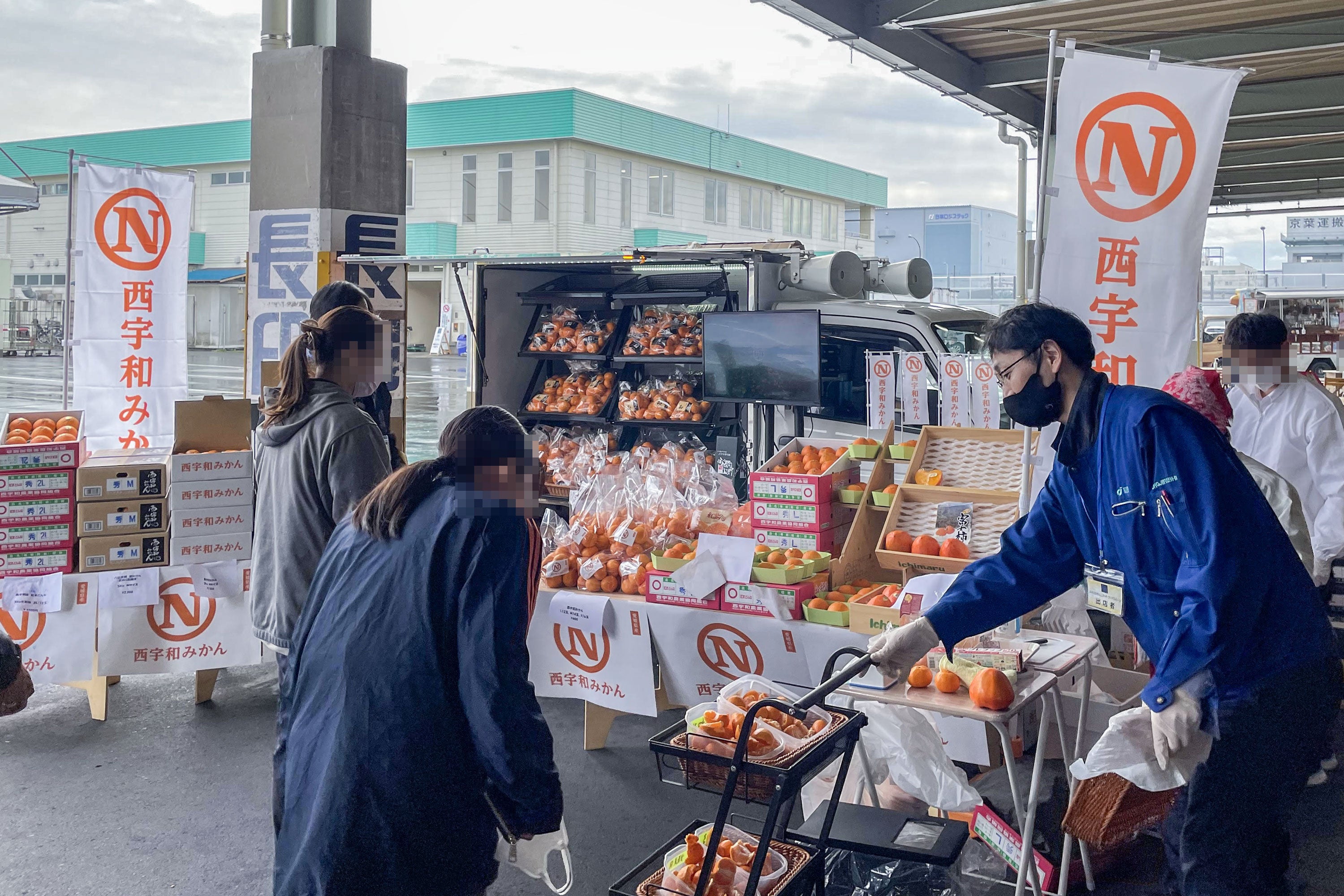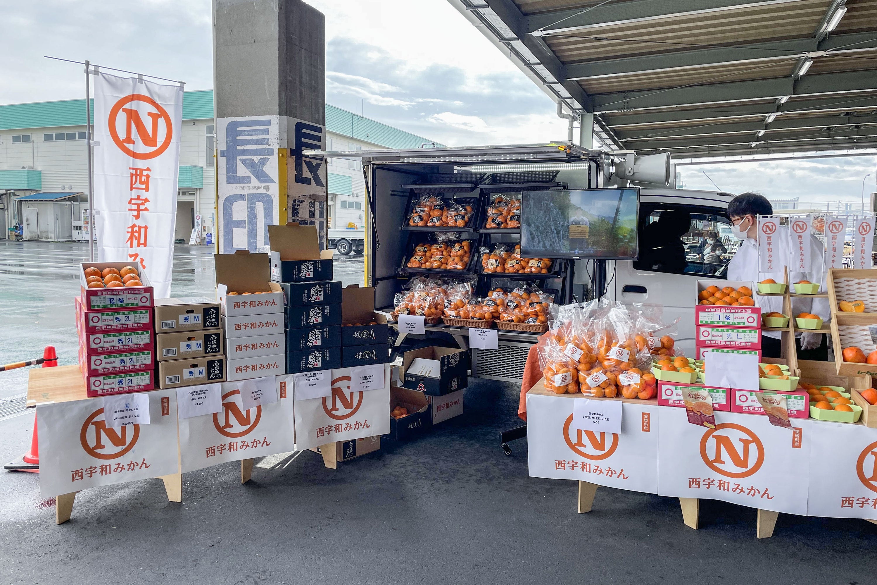 西宇和みかんのNマークが大きく入った販売車の周りでは、温州みかんのほか、西宇和の名産である「富士柿」や「紅まどんな」も販売。