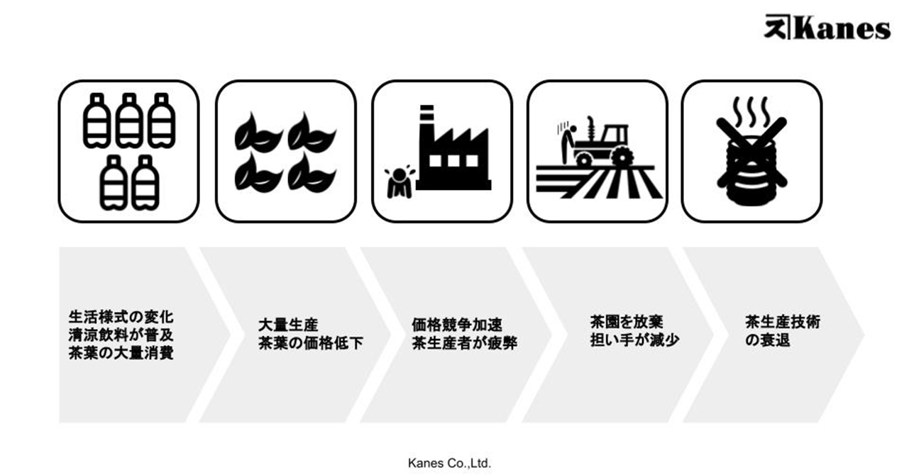 その結果、茶葉の大量生産・大量消費が国内マーケットの主流になっていき、原料茶葉を供給する生産者は価格競争の末に疲弊、茶園を手放すという現象が各地で起きています。これは最終的に後継者不足による担い手の減少にも大きく影響しています。