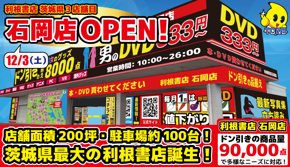 - 「利根書店古河店」「利根書店下館店」に続き、茨城県3店舗目の利根書店としては、店舗面積や駐車場、商品量全てにおいて茨城県内最大規模の「利根書店石岡店」を1日㈯に開店