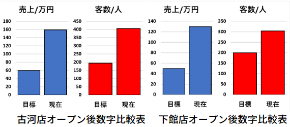 9月23日㈮の古河店オープン後3日間の売上が、グラフ左の通り売上目標の265%、来客数目標の209%を達成いたしました。