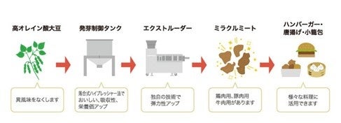 従来の植物肉は、大豆搾油後の残渣物である脱脂加工大豆を主原料としていましたが、「ミラクルミート」は原料に丸大豆まるごとを使用しています。さらに、オレイン酸リッチ大豆を使用することで、大豆特有の臭みを無くし、異風味を低減しています。