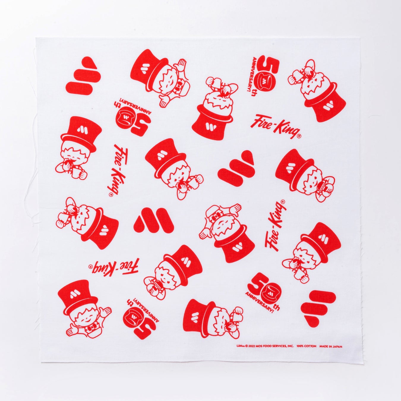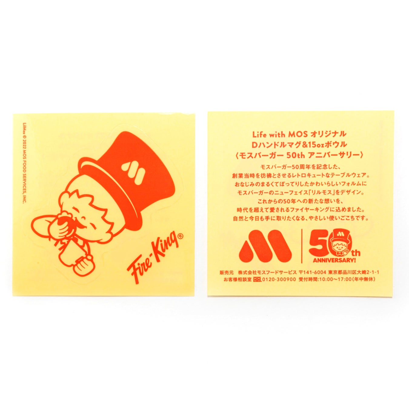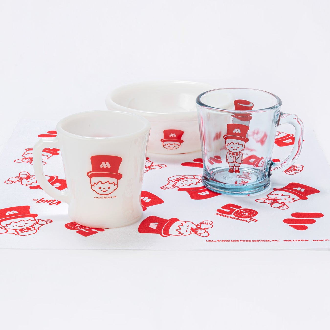 どちらの商品にも、モスバーガー50周年マークや様々な表情のリルモスのほか、FireKingロゴを総柄にあしらった、本コラボレーション限定の「オリジナルクロス」と、Fire-Kingマグを持つリルモスの書き下ろしイラストの「特製ステッカー」を封入してお届けします。