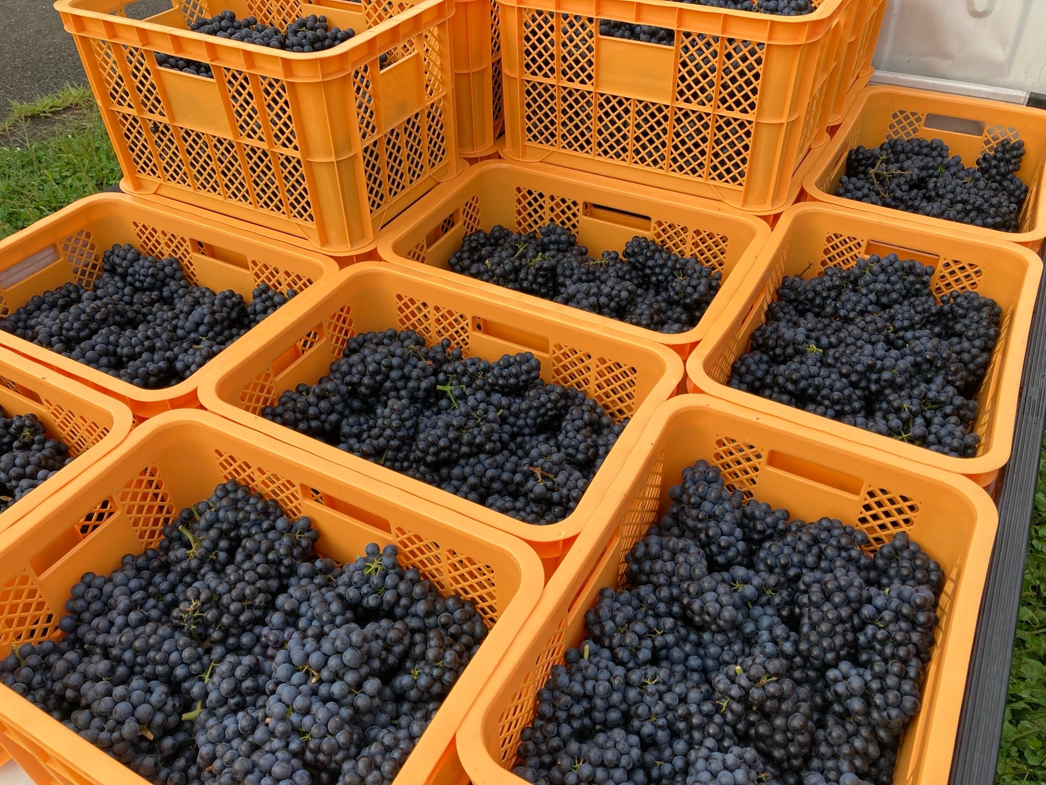 2021年はファーストヴィンテージ用の収穫となりました。早生のツヴァイゲルトレーベは、収穫予定日直前の降雨で計画を前倒しで収穫しましたが、ほぼ例年同等の糖度・酸度を計測しました。ツヴァイゲルトレーベは密着房で玉割れしやすい品種なので、ヴェレゾン前の果粒肥大期から収穫直前までの房の管理(果粒を間引く摘粒、病果の除去)が房の健全性を保つ上で重要ですが、今シーズンはこれらをきっちり行うことができ、きれいな房のいい状態で収穫できました。その結果、仕込み時のマロラクティック発酵が終わるまで酸化防止剤を添加しなくても順調に発酵管理を行うことができました。晩生のメルローは、10月中旬、糖度、着色向上を期待して例年より遅めに収穫しました。