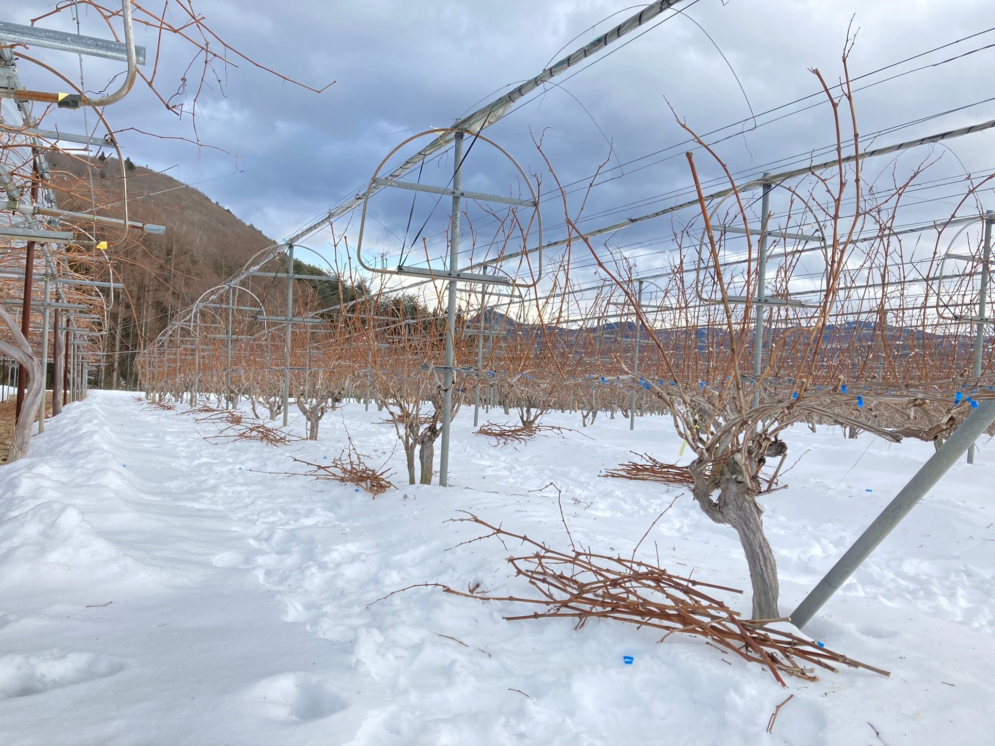 年末から1月前半にかけて厳しく冷え込む日が続き、日照時間は平年より少なく、積雪量は平年より多い、冬らしい冬でした。この時期の圃場は雪深いため、デスクワーク主体で今シーズンの計画作成などを行いました。寒さが和らぎ始める2月下旬ごろから、今シーズンの栽培管理作業の第1番目として、剪定作業が始まりました。