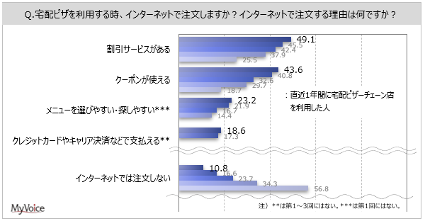 インターネットで注文する理由は(複数回答)、「割引サービスがある」「クーポンが使える」が各40%台で増加傾向です。「割引サービスがある」は男性30代、「電話で注文するのが面倒」は女性や若年層で高くなっています。