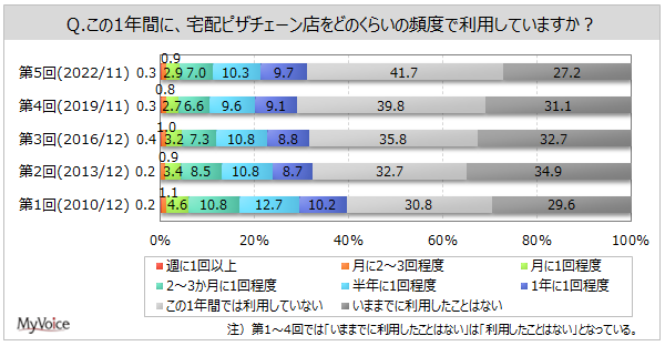 | <今 回>(2022/11)https://myel.myvoice.jp/products/detail.php?product_id=29207 ※上記設問の他に「1年以内に利用した宅配ピザ」「コロナ禍による利用頻度の変化」も聞いています。 <第4回>(2019/11)https://myel.myvoice.jp/products/detail.php?product_id=25607 <第3回>(2016/12)https://myel.myvoice.jp/products/detail.php?product_id=22111 |