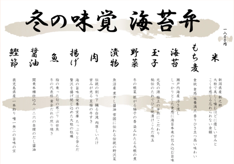 来たるこの冬、光る食材・旬のもの・素材を活かし、季節を感じる冬の味覚、ご馳走ばかりを並べました。季節限定の商品ですので、今しか食べられない食材の海苔弁をぜひ。