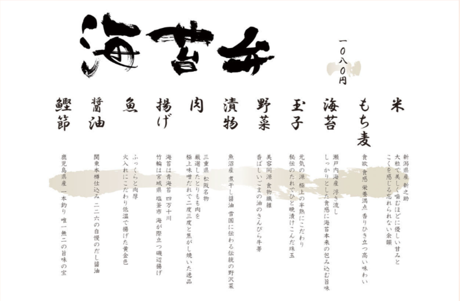 「海苔弁」それは日本が誇る弁当文化。日本全国の本物の食材を集め、ひとつひとつがすべて主役になるように。そしてすべてが絡み合うように丁寧に仕上げたひとつの「海苔弁」。