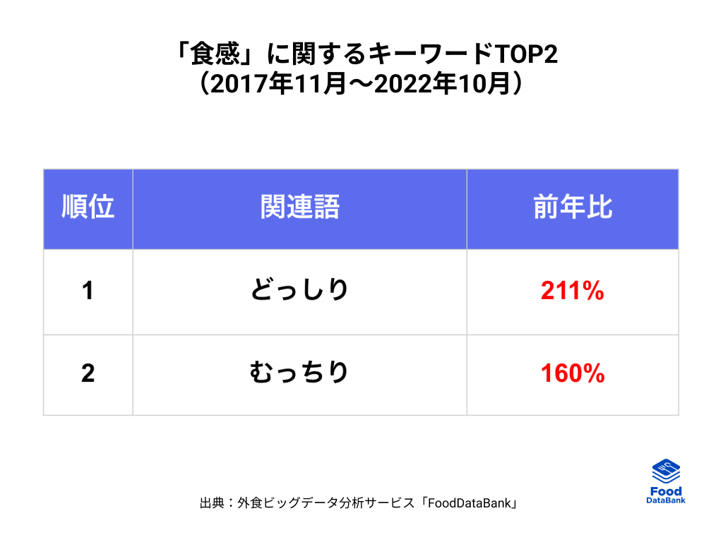 外食ビッグデータ分析サービス「FoodDataBank」から「食感」に関するキーワードを見てみると、「どっしり」が投稿前年比200%を超える伸長を見せ1位に、次に「むっちり」という特徴的なキーワードが2位に出現していることが分かりました。