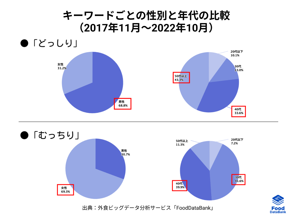 1位2位のキーワードを性別と年代別に注目してみると、「どっしり」は男性が、「むっちり」は女性の比率が高いことが分かりました。年代では「どっしり」が40代以上、「むっちり」が30代・40代の割合が高いようです。