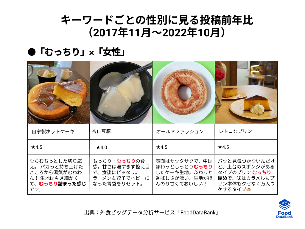 一方で「むっちり」×「女性」の投稿は、”詰まった感じ”や”硬め”というように、凝縮された密度のある料理が高評価の傾向にありました。