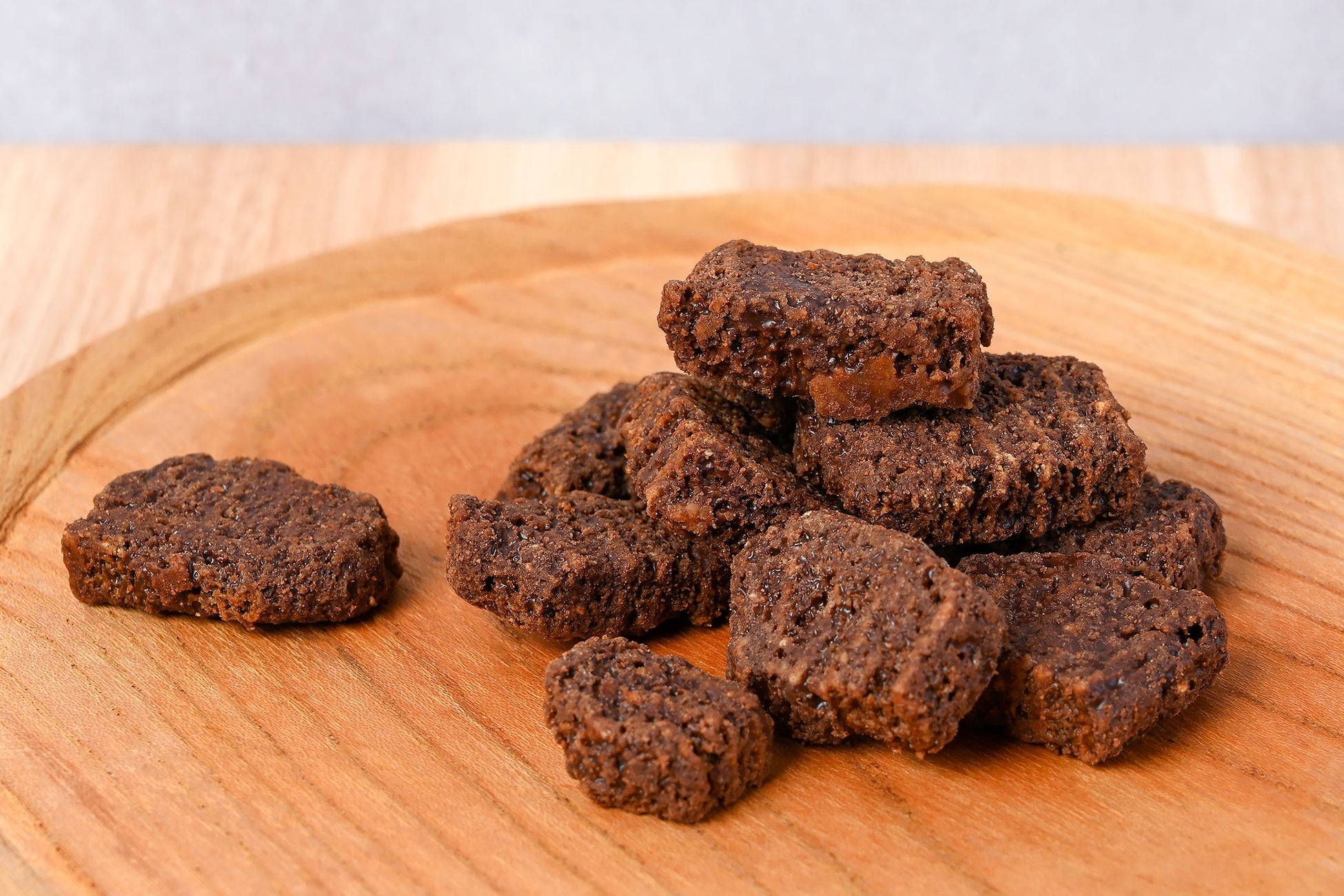 製造過程で出てしまう型ぬきバウムの“はじっこ”をひとくちサイズのラスクにして、ちょっぴりビターなチョコをしみこませました。しっとり軽く、ついつい手がのびてしまうおいしさです。
