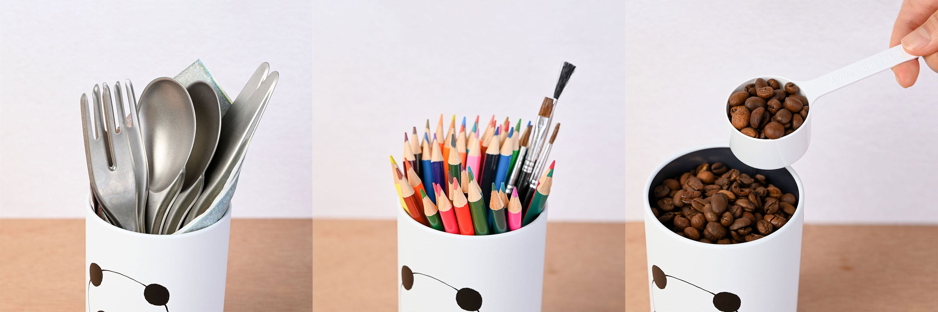 お気に入りの茶葉やコーヒー豆をいれて、キッチンに。ペン立てとして、デスクのうえに。
