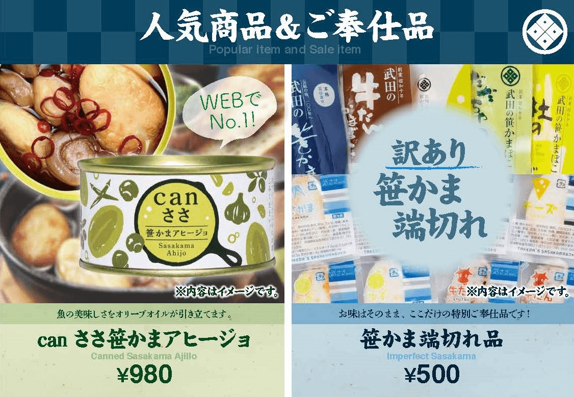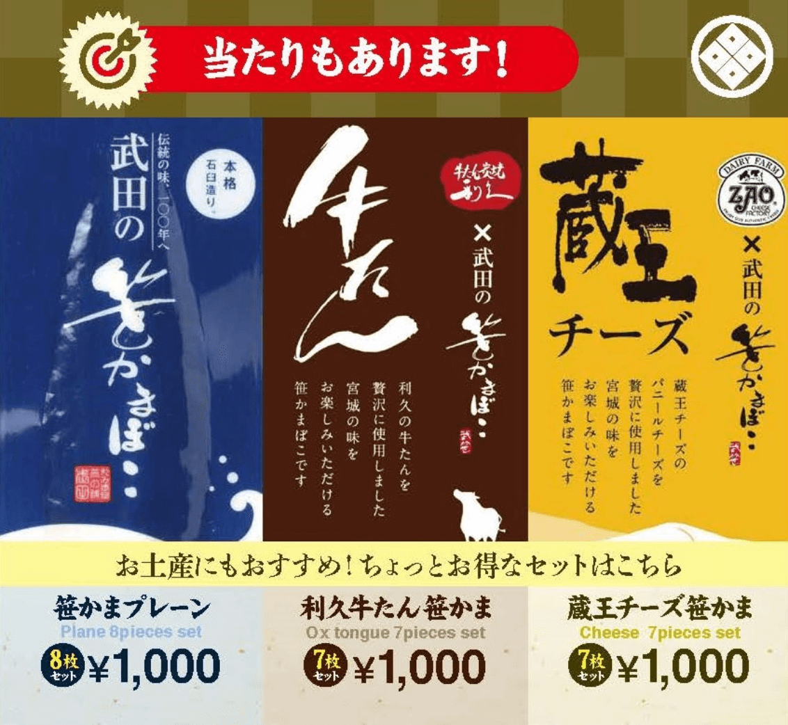 販売商品は、「笹かまプレーン2枚セット」、「利久牛たん笹かま2枚セット」、「蔵王チーズ笹かま2枚セット」、「笹かまプレーン8枚セット」、「利久牛たん笹かま7枚セット」、「蔵王チーズ笹かま7枚セット」、「canささ笹かまアヒージョ」、「笹かま端切れ品」の8種類。値段は320~1,000円で販売しています。 お手軽に購入できるので、お土産にも最適です。