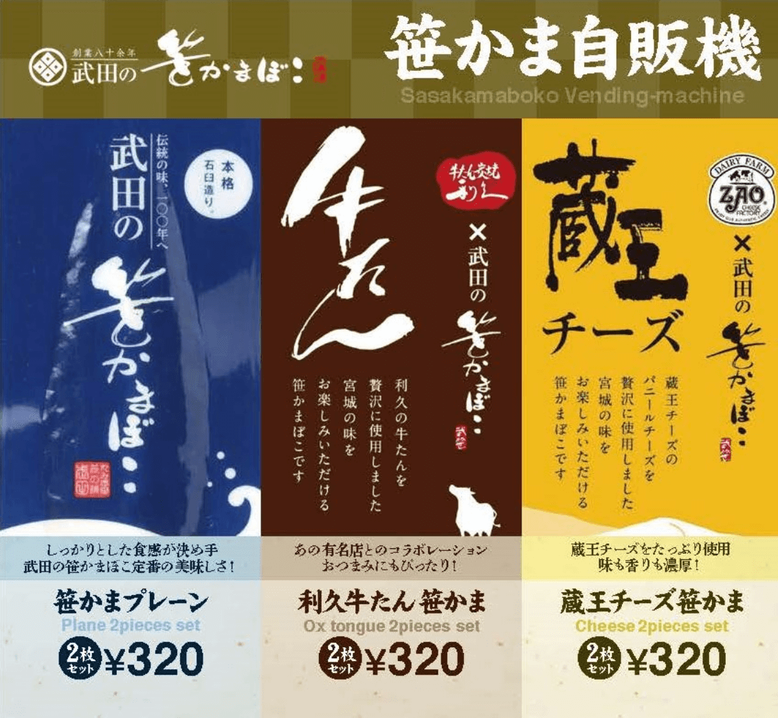 武田の笹かまぼこ様は笹かまぼこ誕生の地、宮城県塩竈で創業以来の伝統製法を受け継ぎ、5つのこだわりを持って製造されています。「製法へのこだわり」、「素材へのこだわり」、「味へのこだわり」、「食感へのこだわり」、「品質へのこだわり」の5つです。塩竈本店の前に設置された自動販売機ではこの5つのこだわりも持って製造された笹かまぼこを手軽に購入できます。