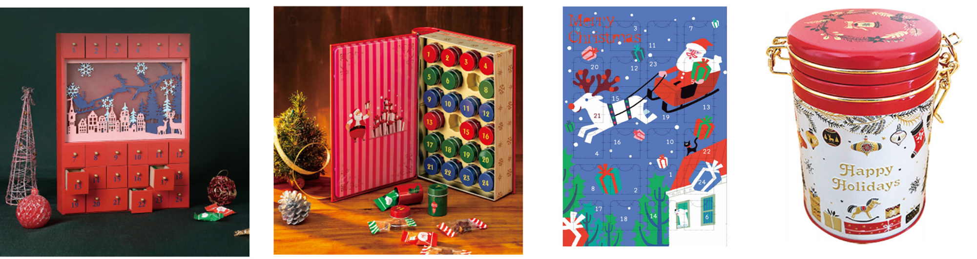 ブック形の缶の中に24日分のお菓子が入った丸い缶が並んでいる、毎年人気のアドベントカレンダーです。