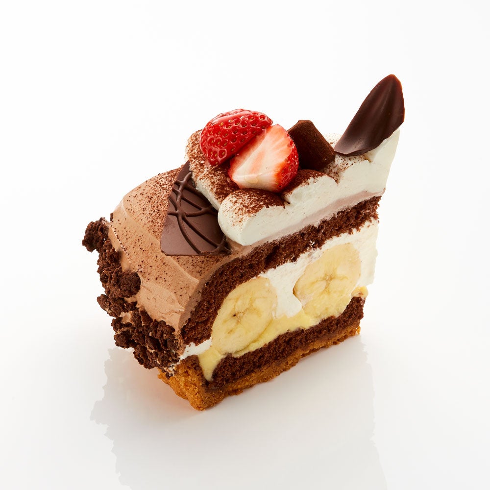 まるごとバナナを生クリームとカスタードクリームで包み、ココアスポンジでサンドして、香ばしいタルト生地に乗せました。
