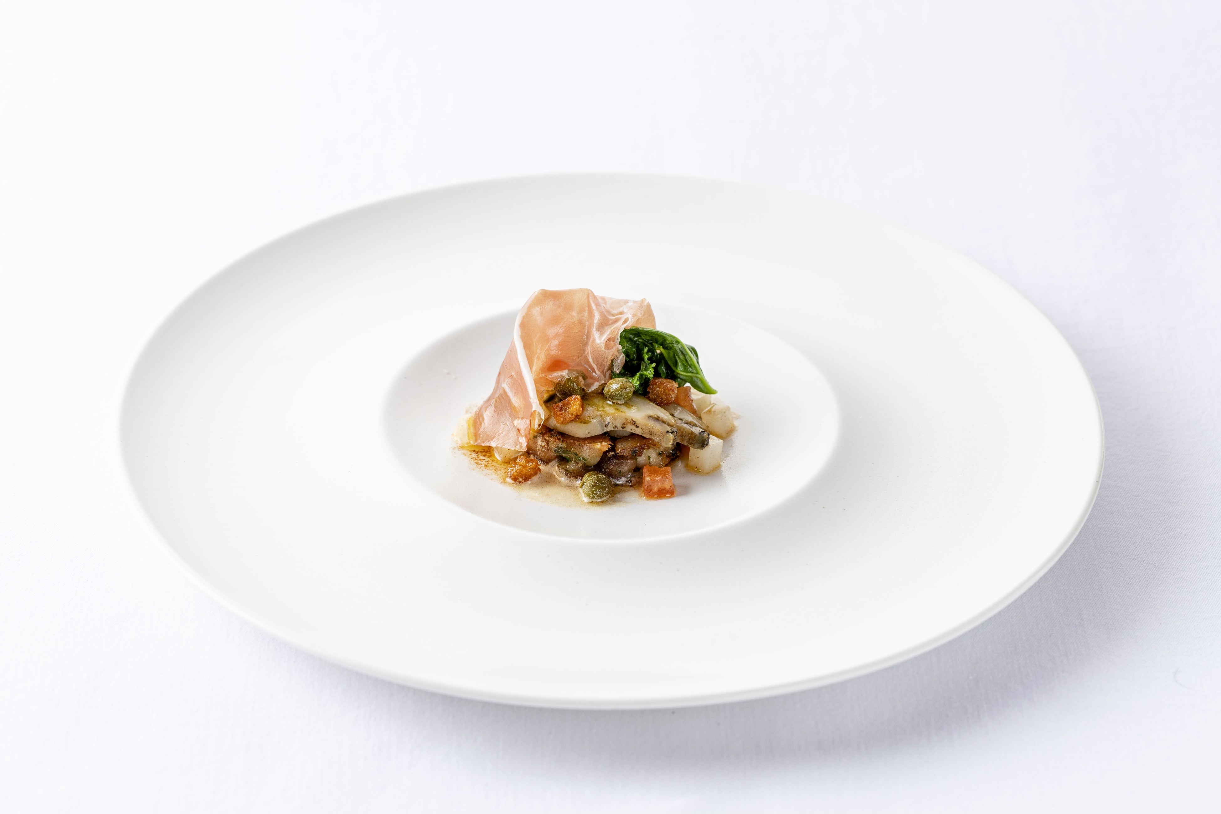 <前菜2> 佐賀県唐津産アワビソテーと豚足のガレット 田嶋畜産の生ハムを添えて