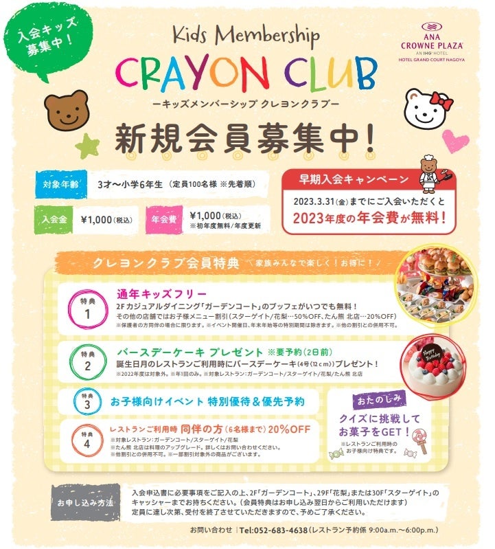 ANAクラウンプラザホテルグランコート名古屋(名古屋市中区、執行役員総支配人:島原 東)は、キッズメンバーシップCRAYON CLUB(クレヨンクラブ)を新設し、2023年度の新規会員を募集します。同クレヨンクラブに入会頂くと、2Fガーデンコートのブッフェがいつでも無料の他、バースデーケーキプレゼント、お子様向けイベント優待割引&優先予約の他に、レストランご利用時同伴の方20%OFFなどの魅力いっぱいの特典付きです。