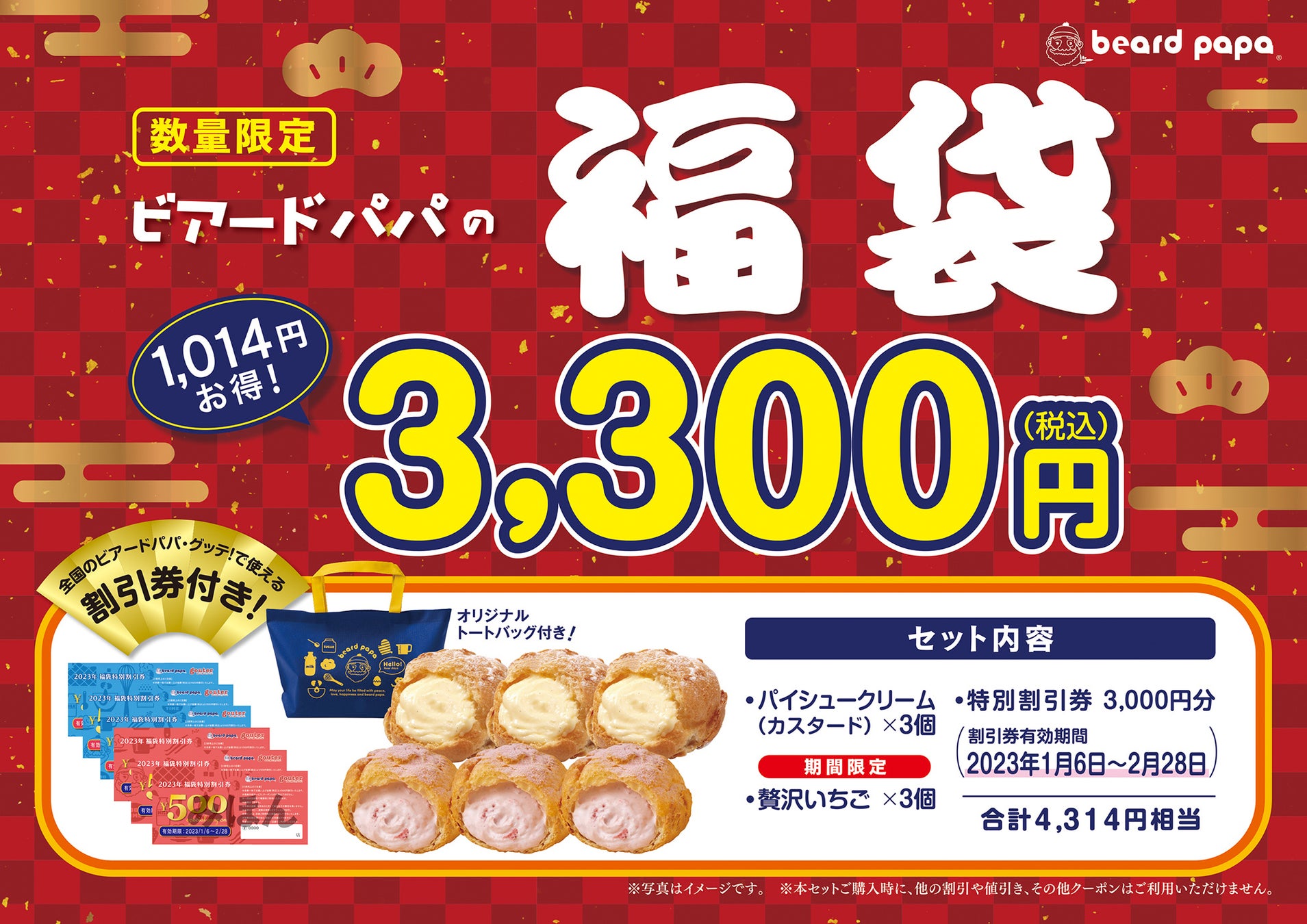 株式会社麦の穂(本社:大阪府大阪市北区、代表取締役:杉内健吉)は、シュークリーム専門店ビアードパパにて2023年1月1日(日)から、お得な特別割引券の入った福袋を数量限定で販売いたします。