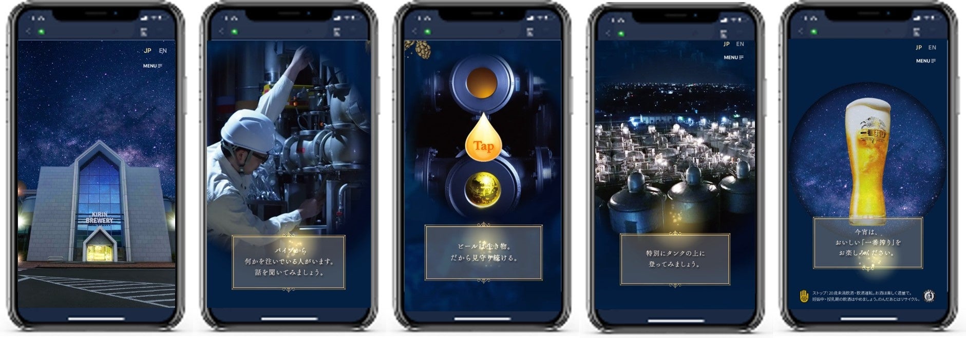 「KIRIN NIGHT BREWERY」は、夜ならではの画像と映像で「臨場感のある世界」を表現しています。昼間の工場見学ではお伝えしきれない、普段は見ることができない工場の裏側をオンラインで体験することを通し、ビールづくりに向き合う 工場の従業員の様子や商品づくりへの安全安心に向けた取り組みなどをご紹介します。