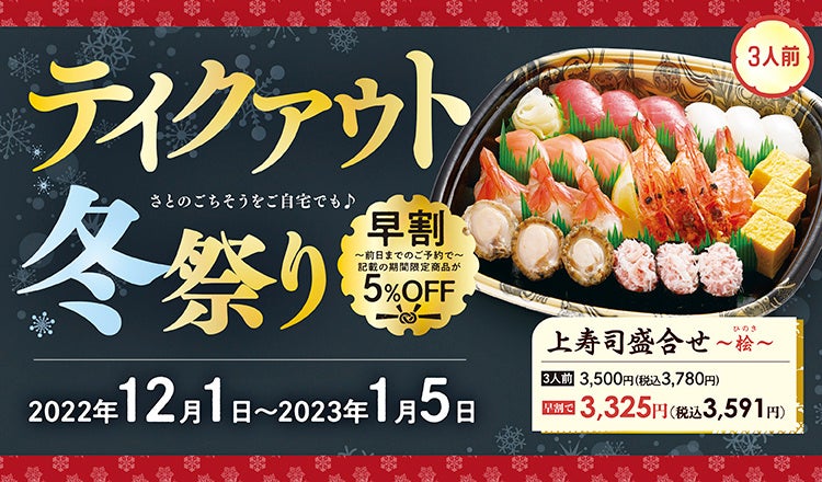 2022年12月1日(木)~2023年1月5日(木)の年末年始限定で、「テイクアウト冬祭り」と題して、お寿司の盛合せや豪華な海鮮ちらし重を特別販売致します。