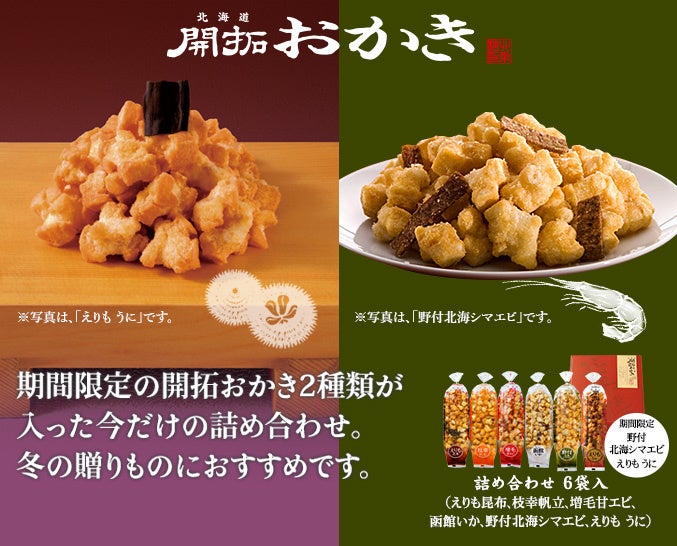期間限定の「野付北海シマエビ」と「えりもうに」が入った6種類の味わいがお楽しみいただける今だけのセット。化粧箱入りで、お歳暮など〈冬の贈りもの〉にもおすすめです。