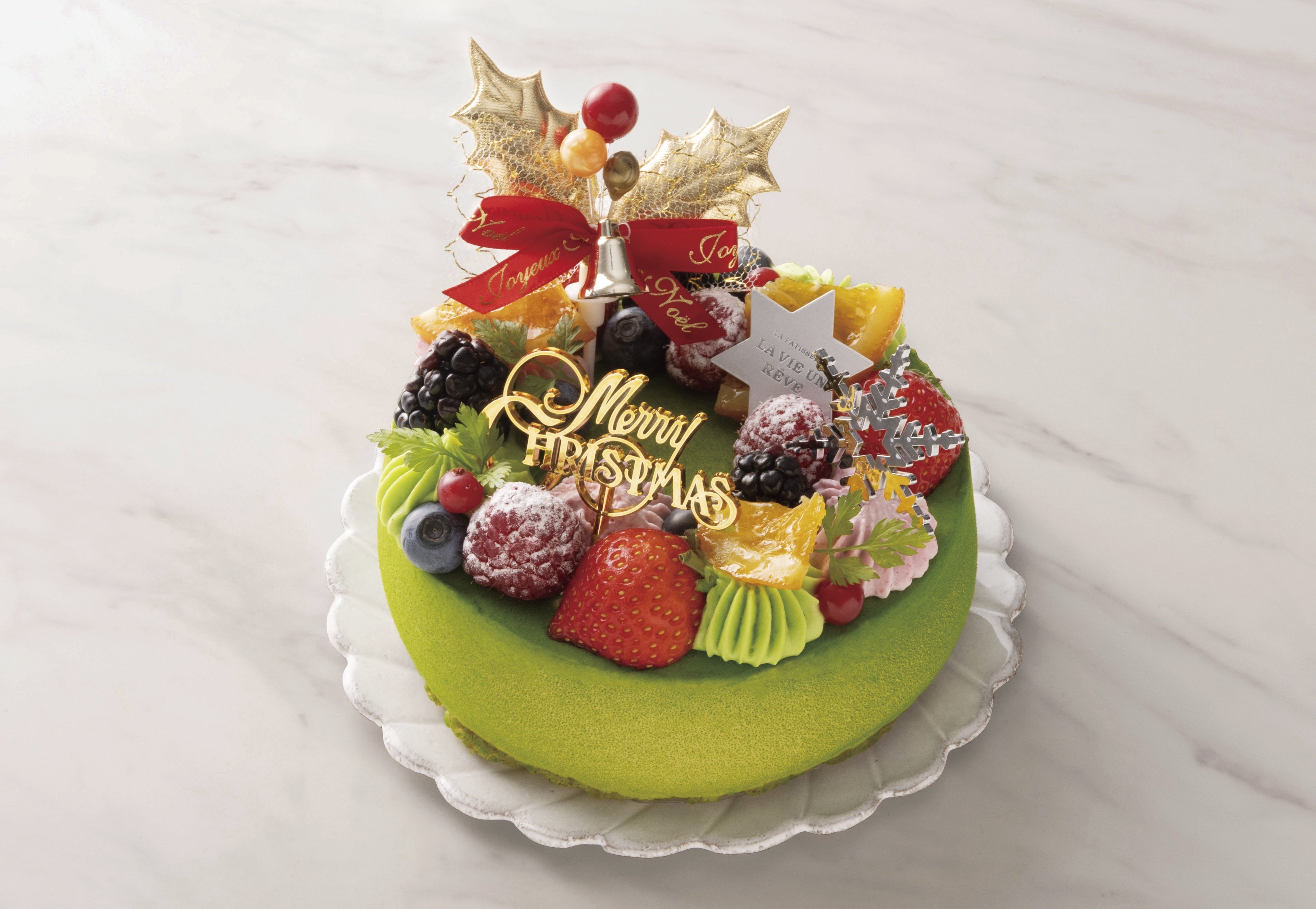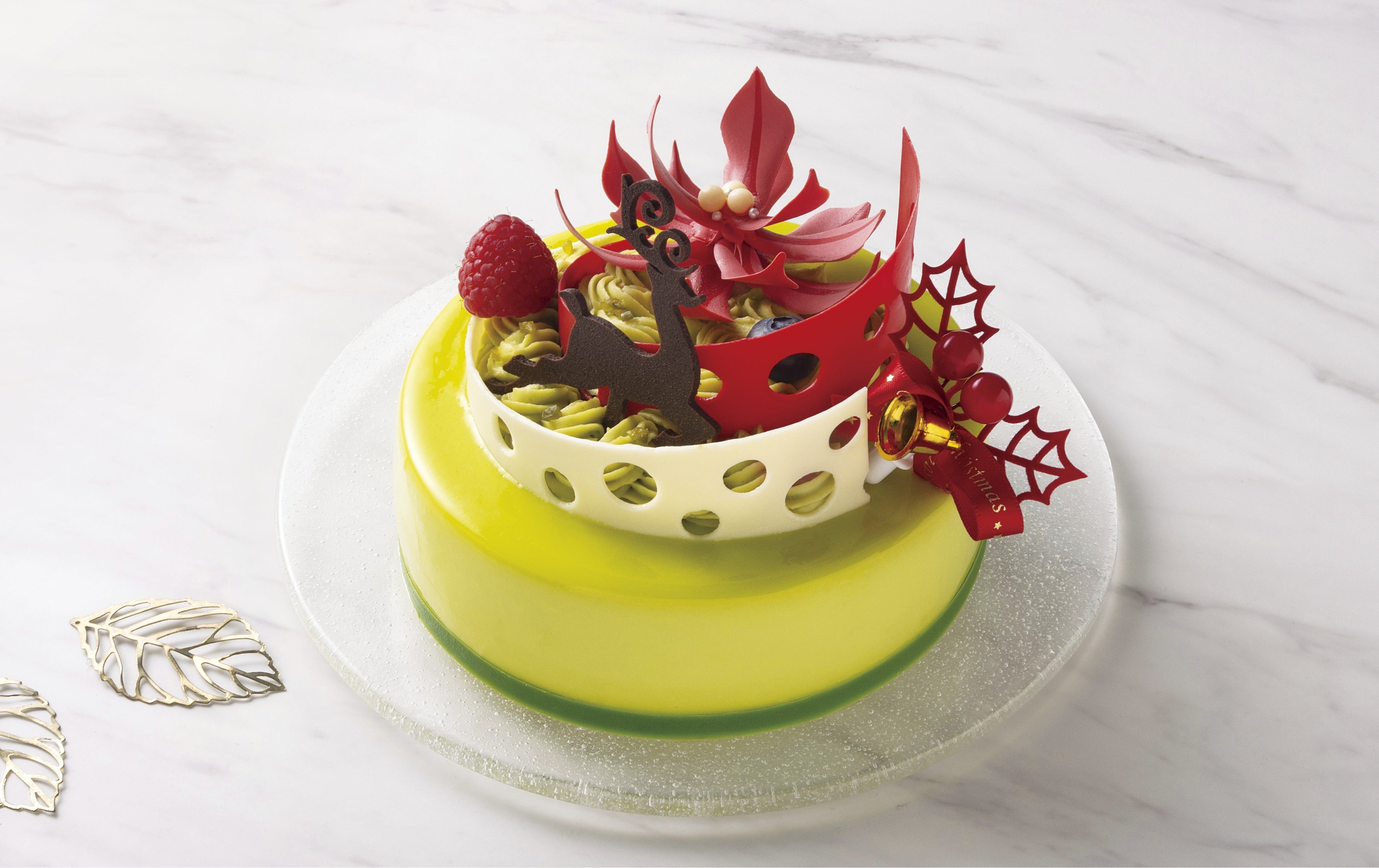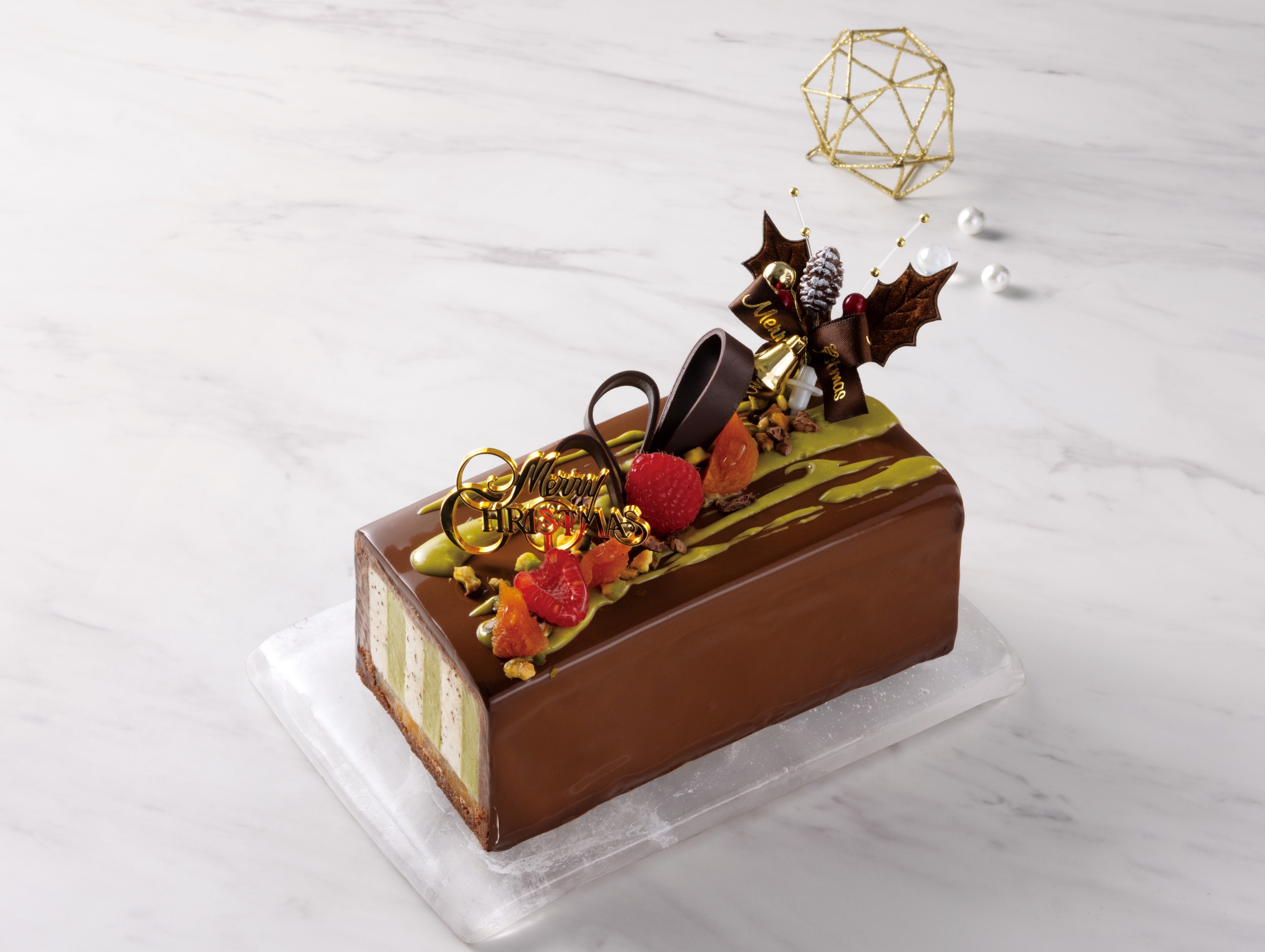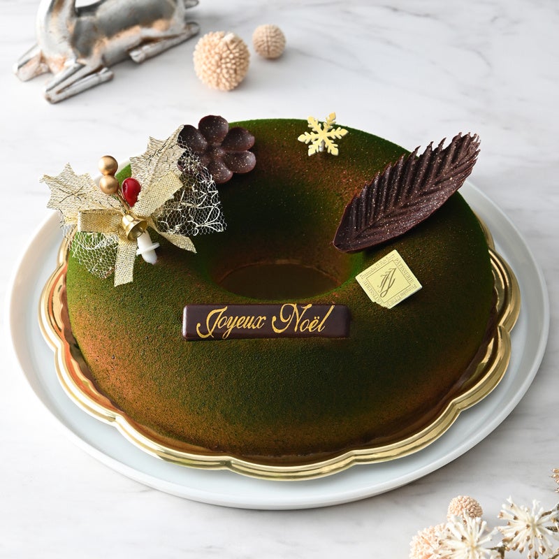 濃厚なピスタチオのクリームやムースに、カシス、赤葡萄、グリオットチェリーを合わせ、生地にきなこを加えた豊かな味わいのクリスマスガトー。