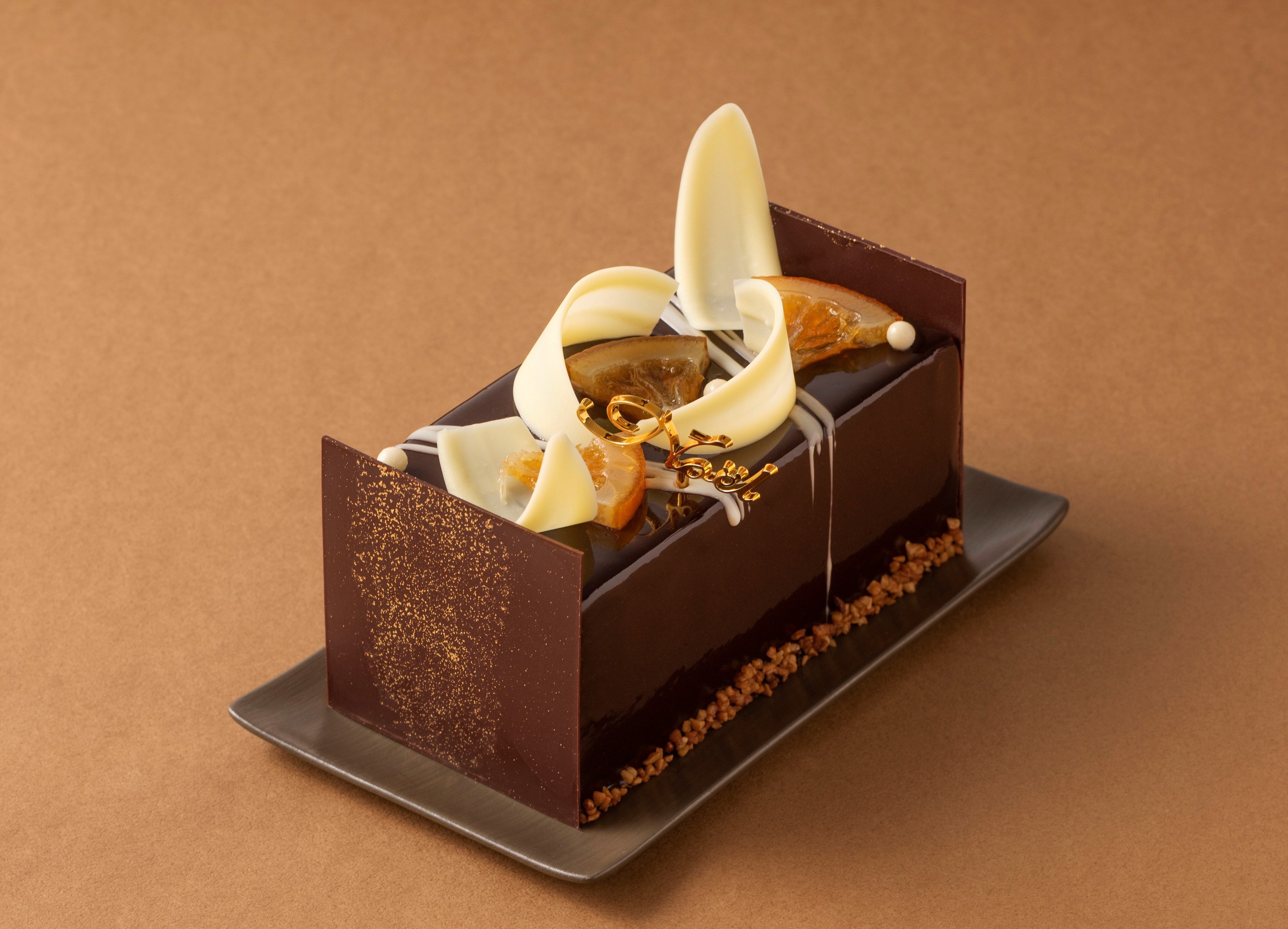 口溶けの良いショコラムースに、ピスタチオムース、ショコラビスキュイ、フランボワーズとグリオットのジュレとサクサク食感のフイアンティーヌプラリネ、ナッツ入りブラウニーを合わせた濃厚チョコレートケーキ。
