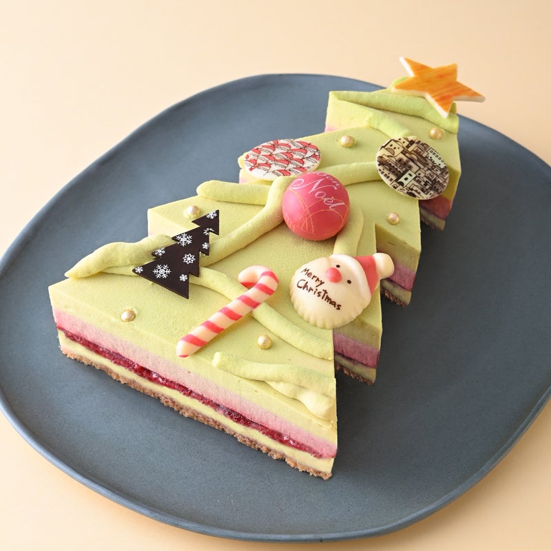 ピスタチオのムースと苺のムース、フランボワーズのコンフィチュール、ダックワーズを組み合わせました。クリスマスツリーをイメージし、チョコレートのオーナメントを賑やかに飾ったケーキです。