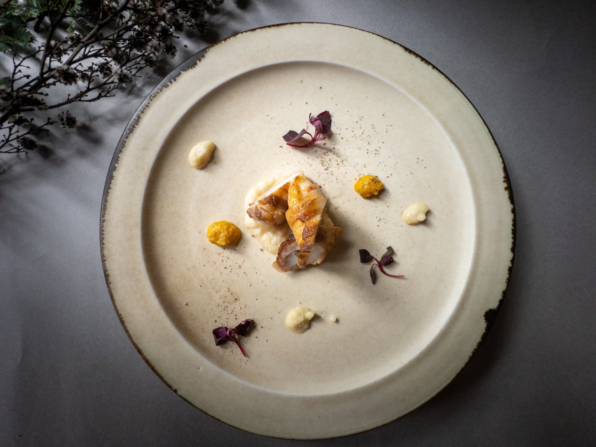 「ラングスティーヌ 自家製燻製ベーコンのソテー 根セロリピュレ」