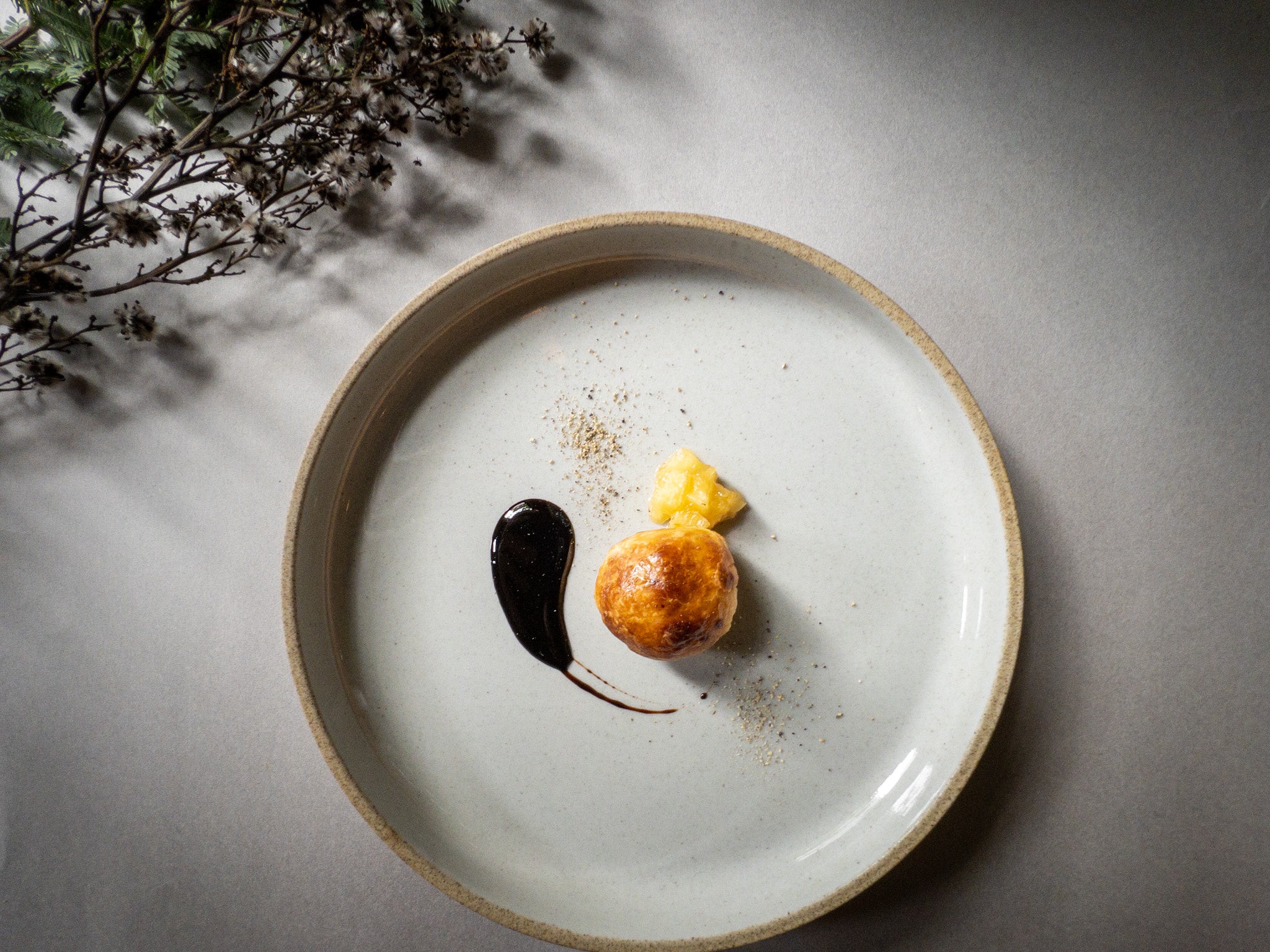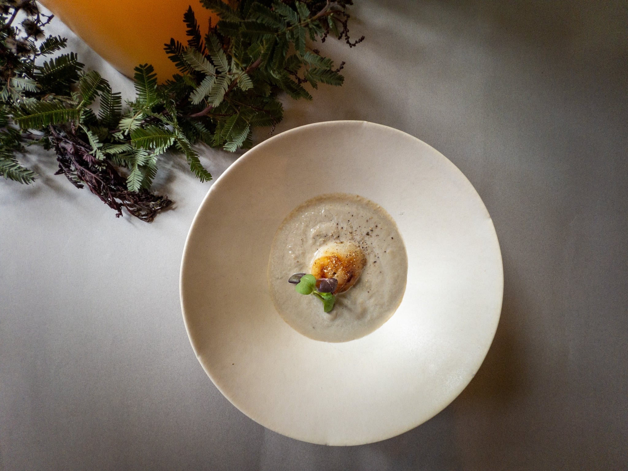 「ラングスティーヌと自家製燻製ベーコンのソテー根セロリピュレ」