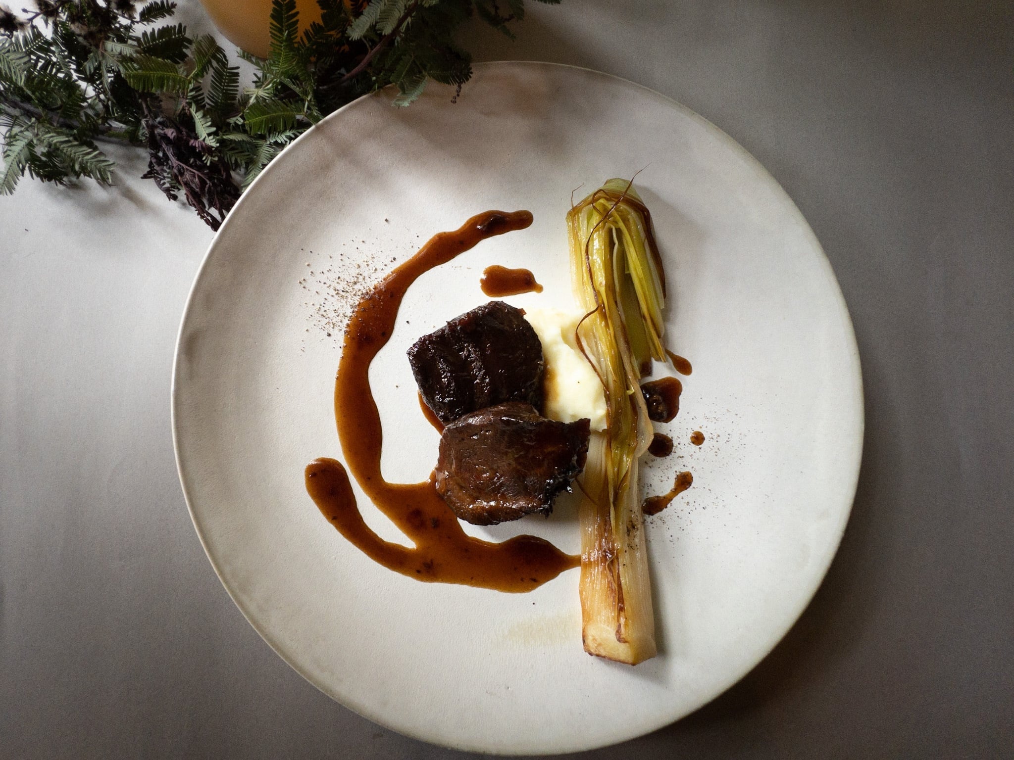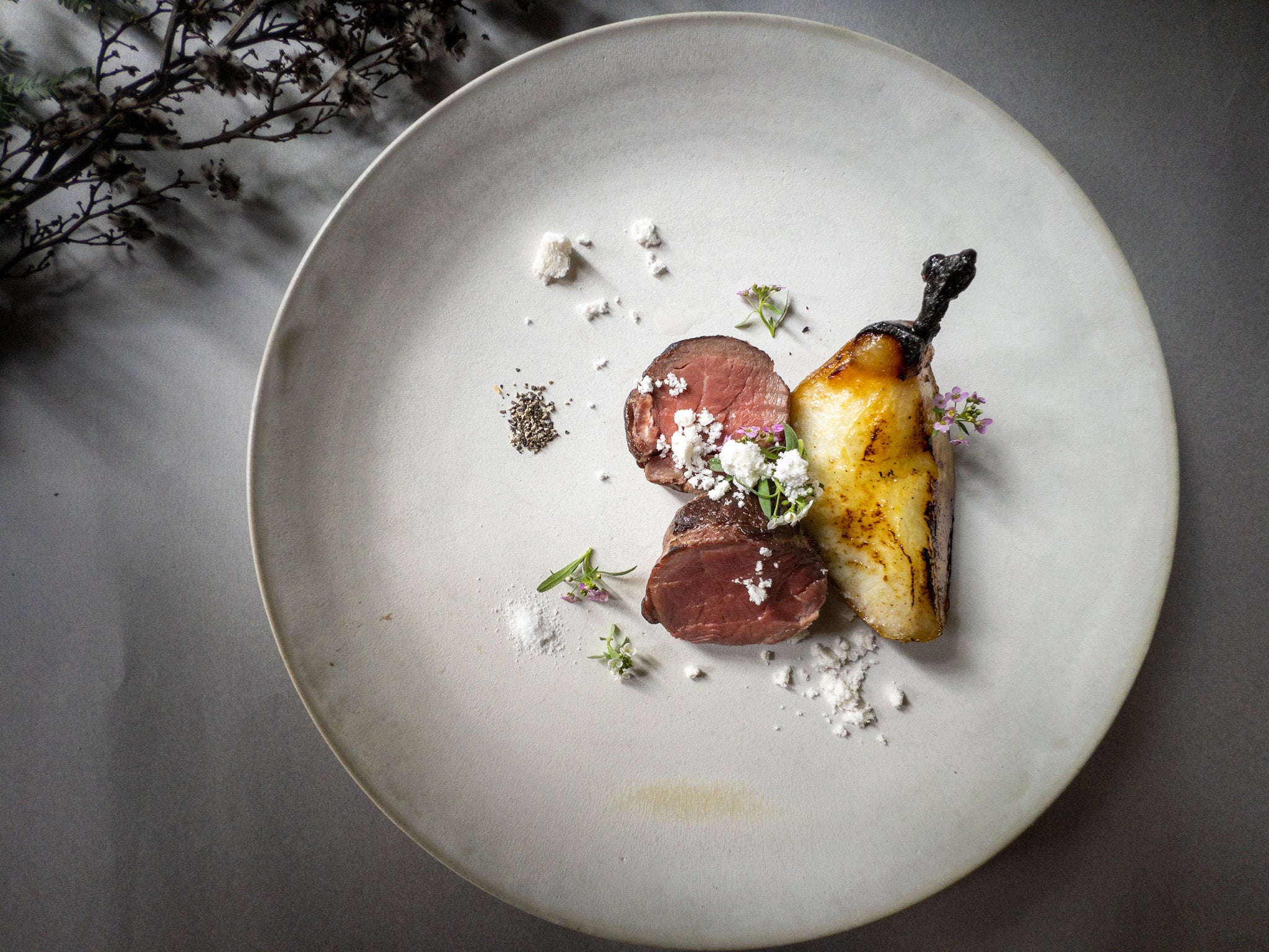 「経産牛フィレ肉のステーキ 洋梨のローストとマッシュポテト添え」