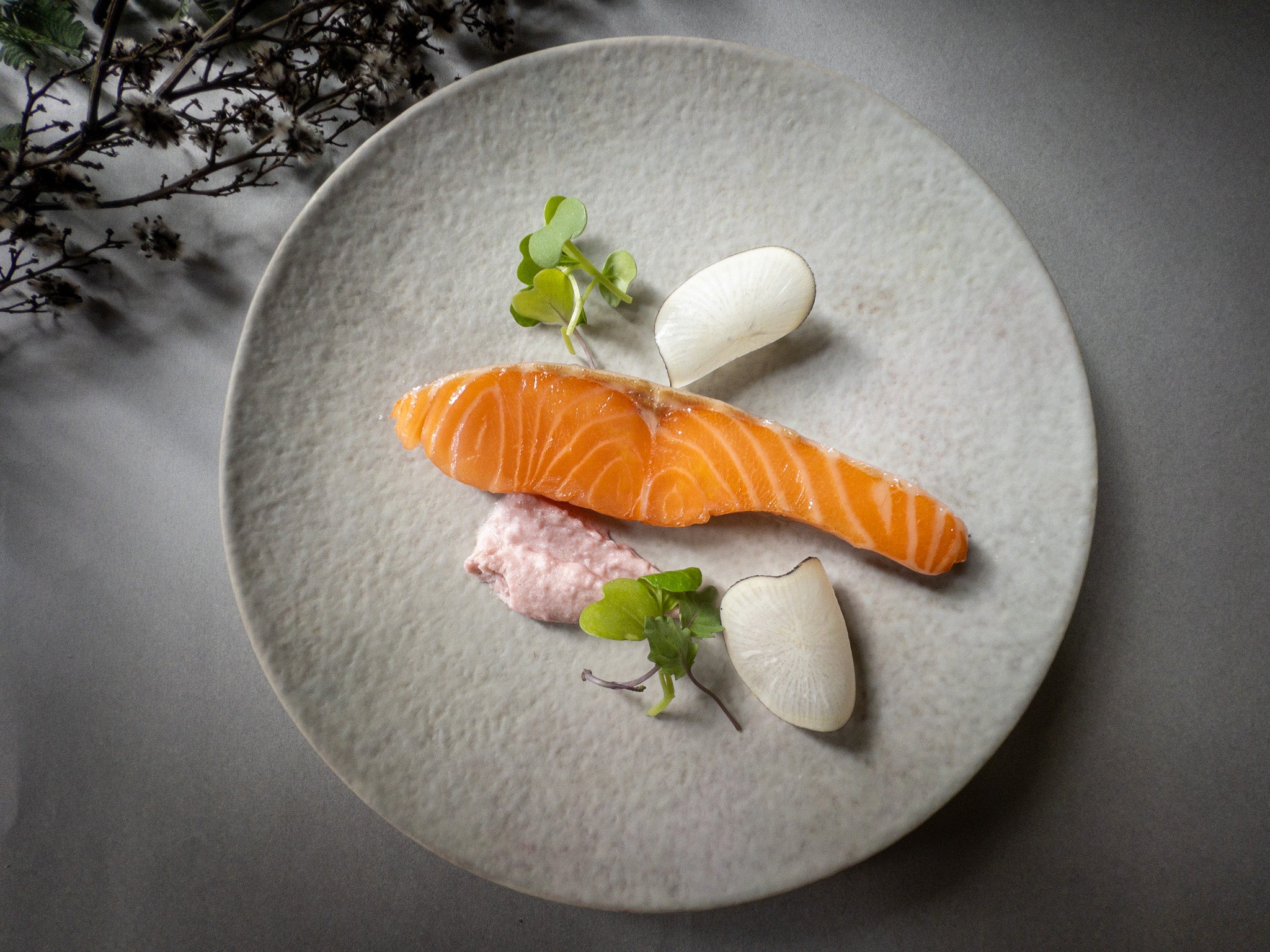 「サーモンのコンフィ ムラサキイモのクリームチーズ」
