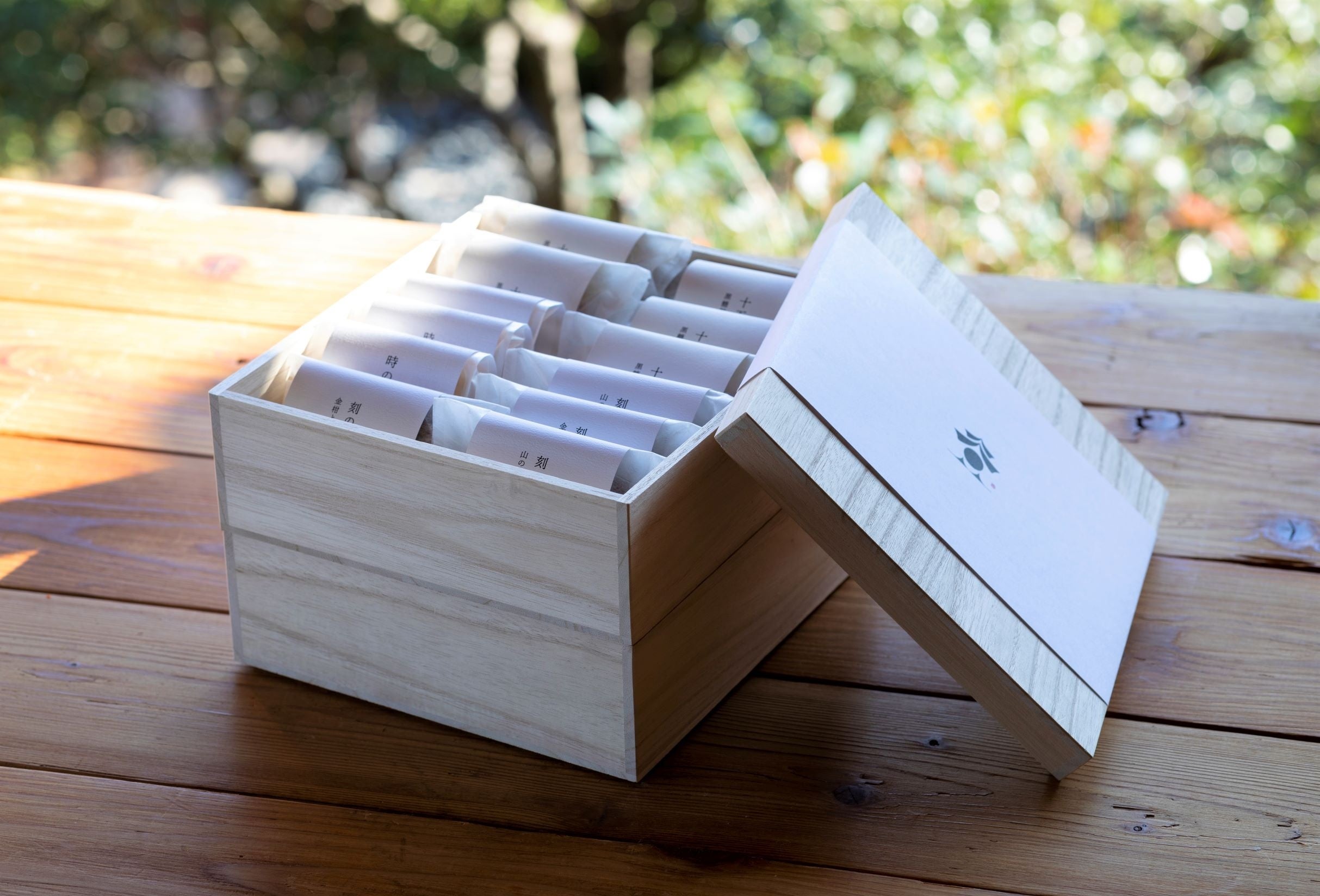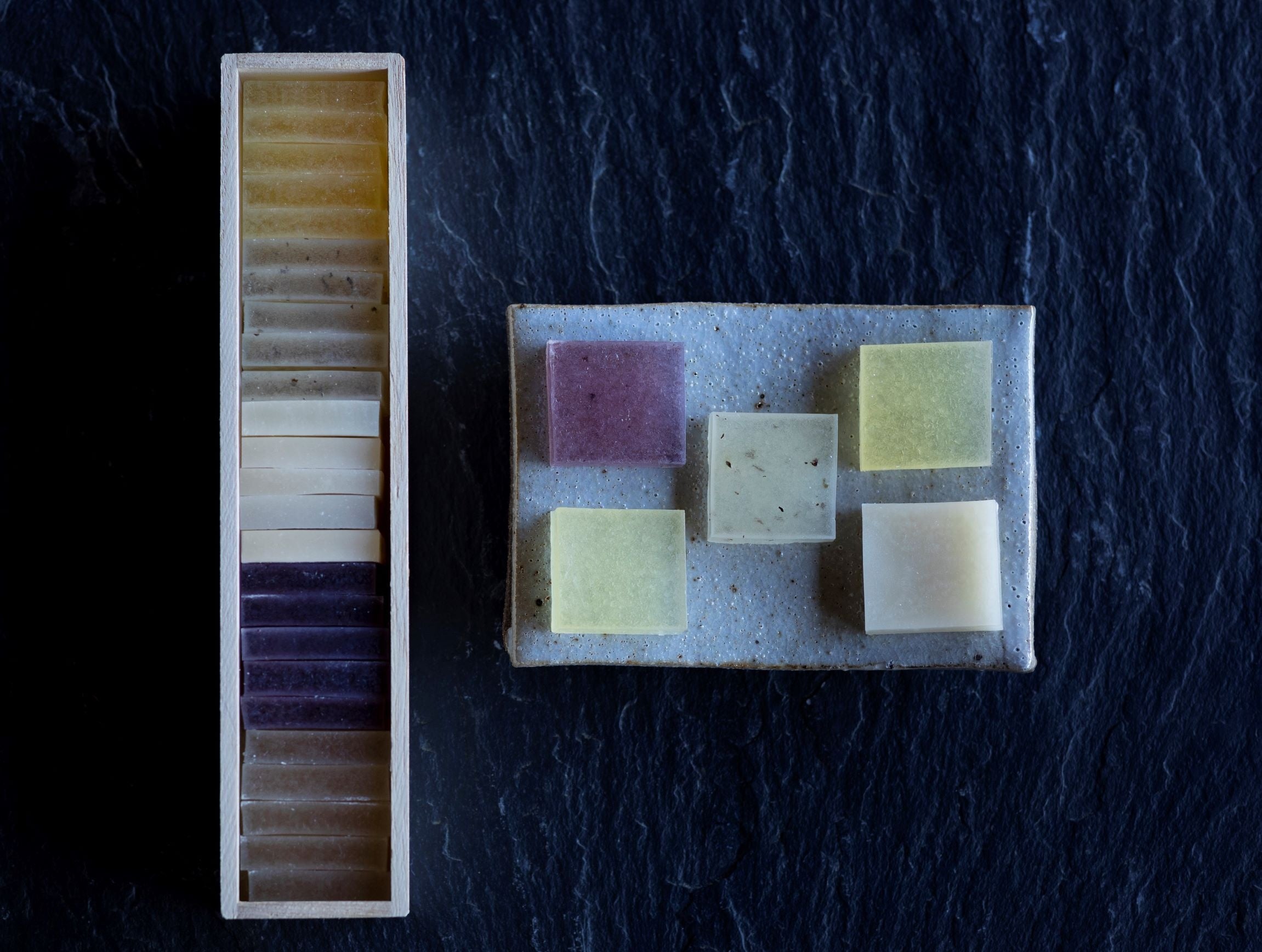 <壺中庵>琥珀糖「天の静寂(しじま)」 3,240円10枚 木箱入り(各5種×2枚)、25枚 木箱入り 6,480円(各5種×5枚)/全5種(酒粕、ペパーミント、日向夏、酢橘、ブルーベリー)