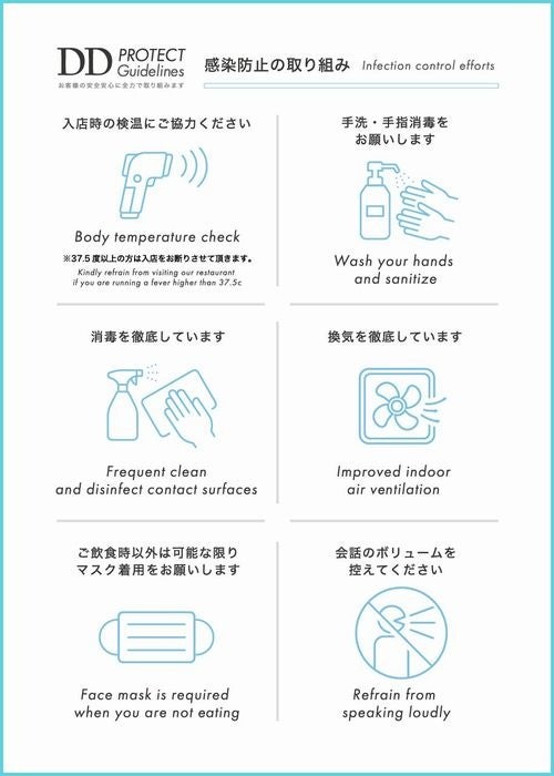 株式会社ダイヤモンドダイニングが運営する各店舗では、お客様に安心してお食事を楽しんでいただくため、行政が定める方針に基づいた感染防止対策を最大限に講じ「DD PROTECT Guidelines」として実施しております。