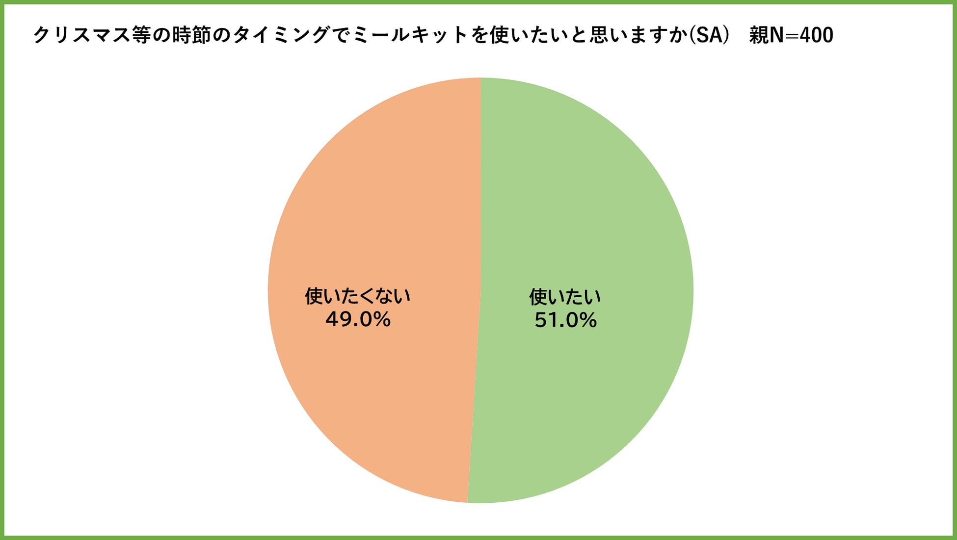 しかし、クリスマス等の時節のタイミングになると半数以上の51.0%がミールキットを使いたいと回答しました。ミールキットは、味はもちろん、見た目にも凝ったものがあるので、クリスマスなどの時節のタイミングで気軽に自宅で楽しめるミールキットに魅力を感じている親が多いことがわかりました。