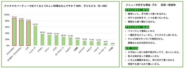また、子どもたちに「クリスマスパーティーで出てくるとうれしいメニュー」について聞いてみると、87.5%が「フライドポテト」、81.8%が「からあげ/フライドチキン」と多くの人がこの2品をあげました。次いで、「ピザ」(77.3%)となり、クリスマスパーティーの人気メニュー3強という結果になりました。3強のメニューが好きな理由を聞いてみると、「普段から食べ慣れているから」(フライドポテト)など普段からの人気メニューであることや、「クリスマスっぽいから」(フライドチキン)、「色々な味があって美味しいから」(ピザ)といったクリスマスらしいメニューやいろいろな味が楽しめることが理由としてあがりました。