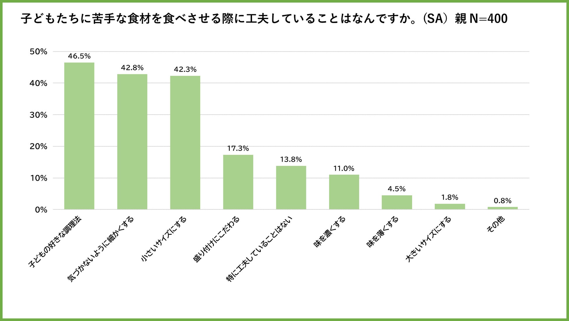 また、実際に子どもたちに苦手な食材を食べさせる際に工夫していることを聞いてみると、「子供の好きな調理法」(46.5%)、「気づかないように細かくする」(42.8%)、「小さいサイズにする」(42.3%)など、子どもたちが食べやすいよう工夫をしている親が多数いることがわかりました。