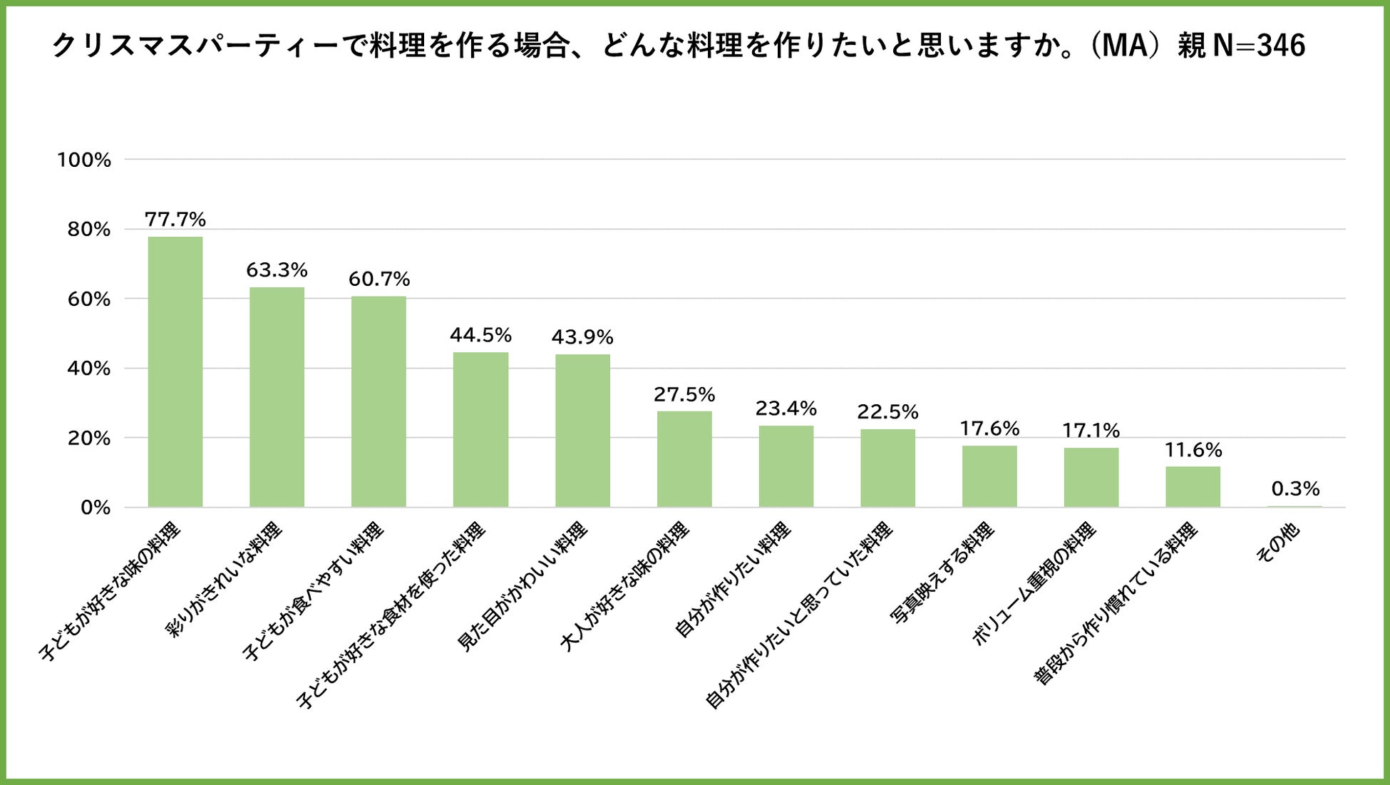 「クリスマスパーティーで何かしら手料理をする」と回答した親に、どんな料理を作りたいか聞いてみると、「子どもが好きな味の料理」(77.7%)、「彩りがきれいな料理」(63.3%)、「子どもが食べやすい料理」(60.7%)など、子どもが喜ぶ料理を作りたいと考えていることがわかりました。