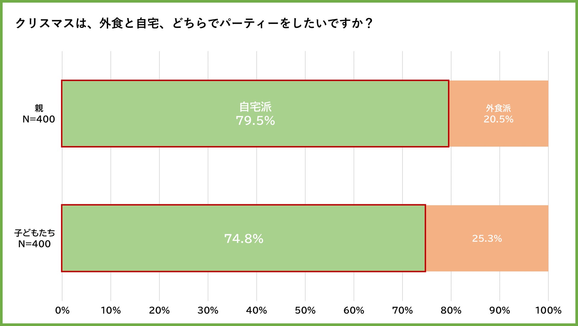 調査ではまず、3年ぶりのコロナ自粛明けとなるクリスマスの過ごし方について聞いてみました。クリスマスパーティーをしたい場所について聞いてみると、親で79.5%、子どもたちで74.8%が「自宅で」と回答しました。コロナ自粛明けとは言え、自宅でのパーティーを望む人が多いようです。