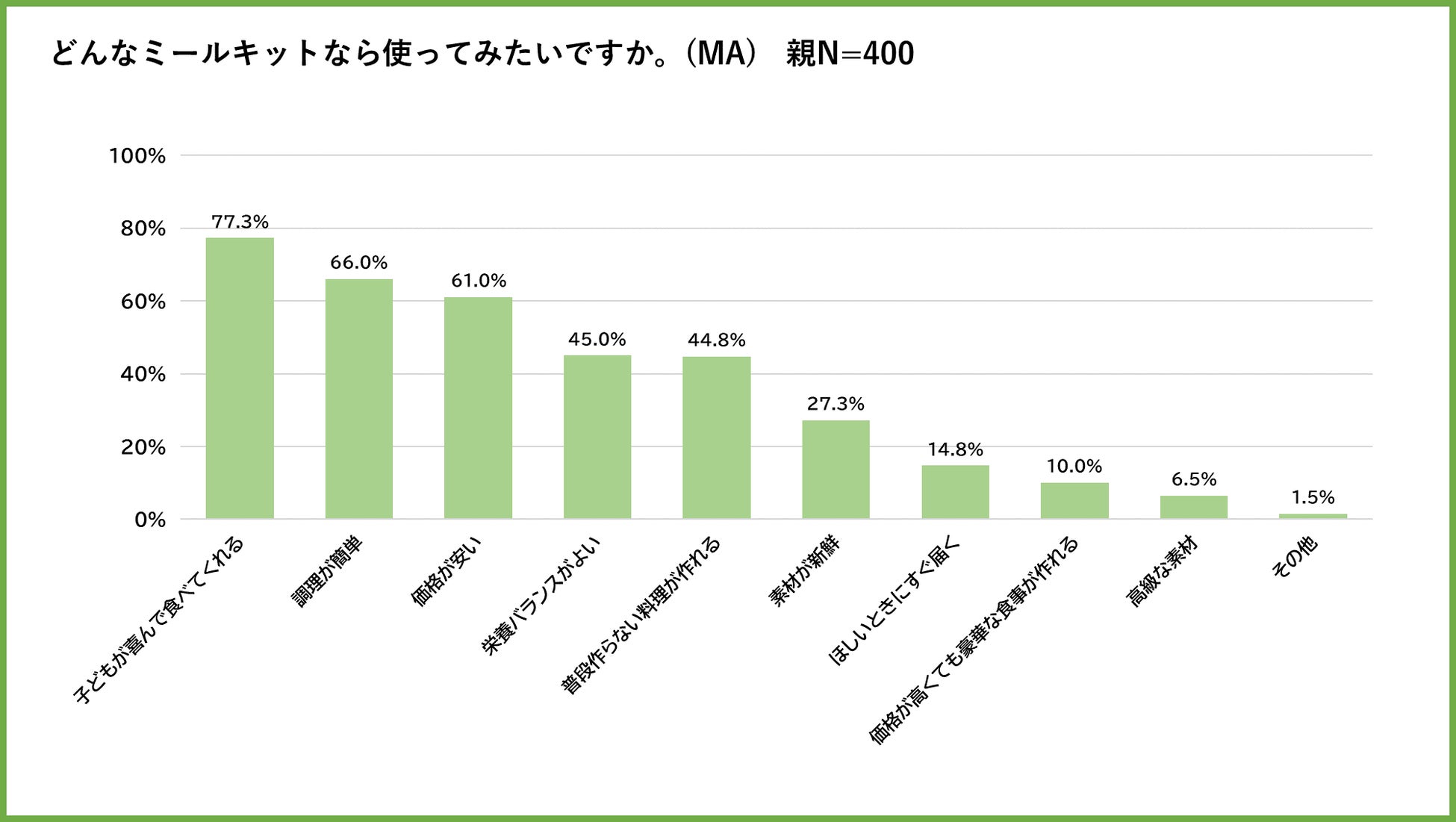 また、どんなミールキットなら使ってみたいか聞いてみると、「子どもが喜んで食べてくれる」(77.3%)がトップになりました。次いで、「調理が簡単」(66.0%)、「価格が安い」(61.0%)が続きました。ミールキットの便利さに魅力を感じている人も多いようですが、子どもたちが喜んで食べてくれるかどうかを重視する親が多いことがわかりました。