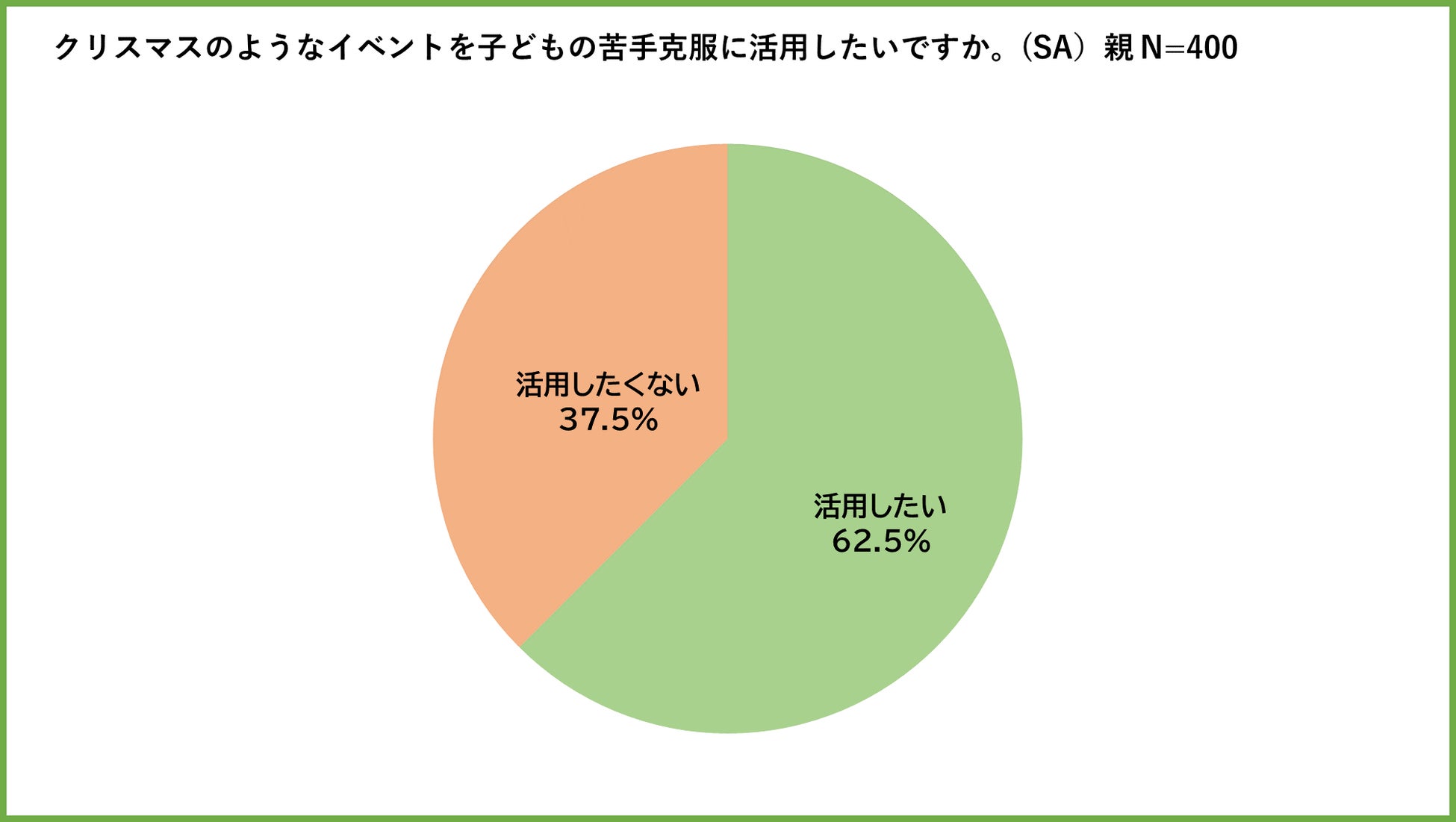 クリスマスパーティーの料理では手料理をする親が多いことがこの調査からわかりましたが、親はクリスマスのようなイベントを子どもの苦手な食材の克服の機会として考えていることもわかりました。62.5%もの親が克服の機会として考えているよう