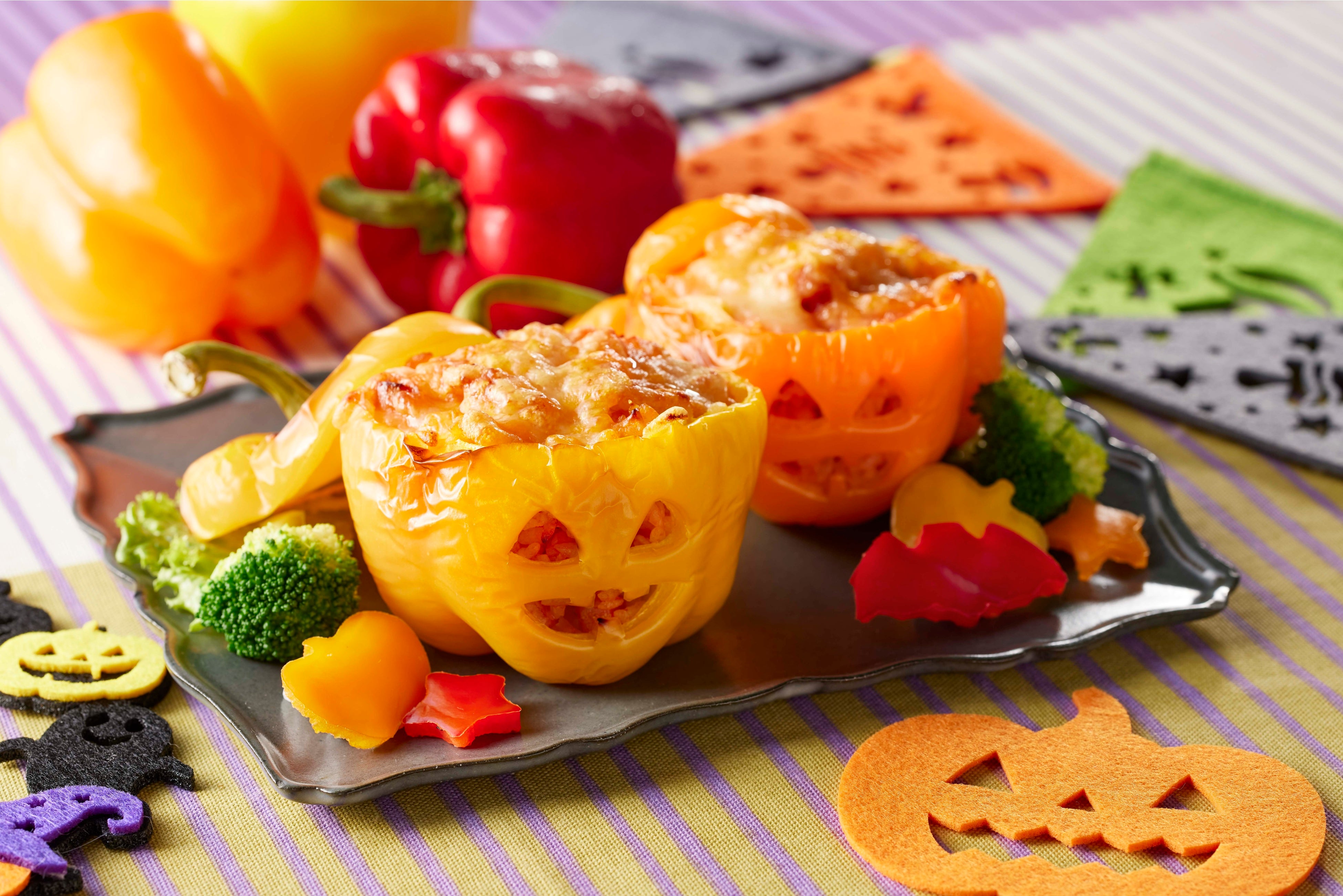 パプリカをジャックオーランタンに見立ててかわいくアレンジした、見た目も味も大満足のケチャップライスです。
