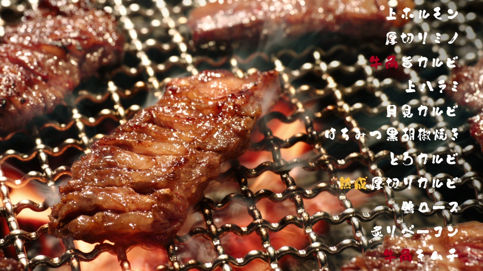 今回堪能するのは牛角の食べ放題コース。壮大なBGMをバックに焼肉を頬張る姿は、まるで感動的な映画のエンドロールのよう。燃え上がる炎、煌めく肉汁、したたる脂・・・焼いたお肉を豪快かつ官能的に口に放りこんでいきます。