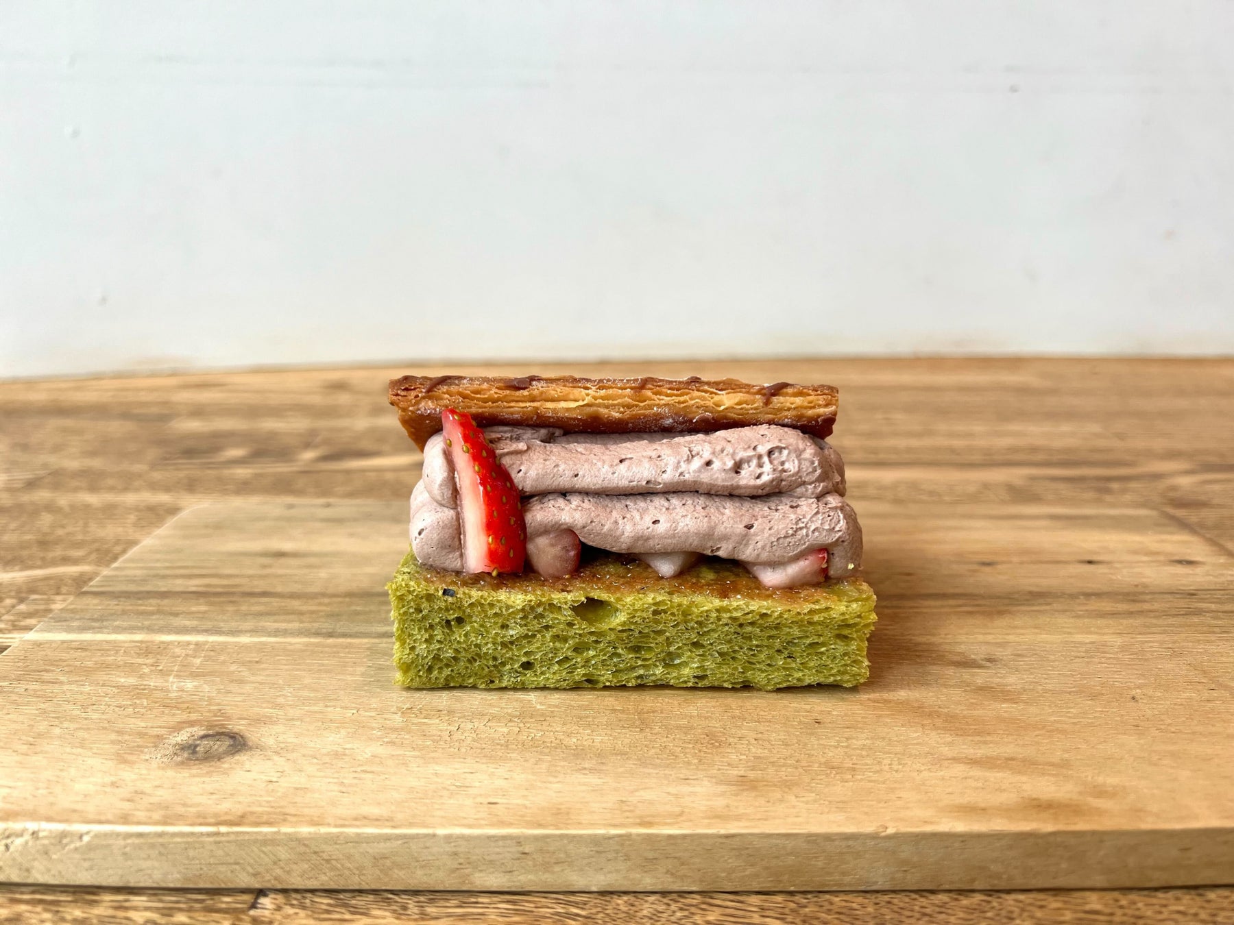 当店自慢のエスプレッソを人気食パン「ムー」にたっぷりと染み込ませた土台を使用。自家製ピスタチオマスカルポーネクリーム、ピスタチオモンブラン、と合わさり今の季節ならではのピスタチオを堪能して頂けます!